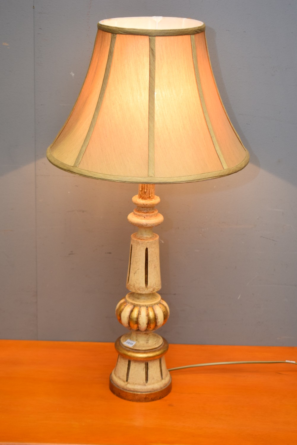A TALL 1920S ITALIAN GILTWOOD FLORENTINE TABLE LAMP WITH FABRIC SHADE (79H CM)