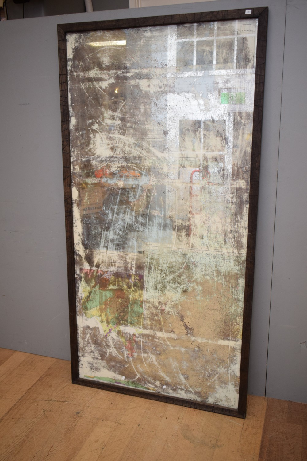 A LARGE BESPOKE WOODEN FRAMED MIRROR WITH MAP BACKGROUND OF GEELONG, PORT PHILIP BAY AND SURROUNDS (206H X 106W CM) (PLEASE NOTE THIS HEAVY ITEM MUST BE REMOVED BY CLIENTS OR CARRIERS AT THE CUSTOMERS EXPENSE. LEONARD JOEL STAFF CANNOT ASSIST CARRYING THIS ITEM)