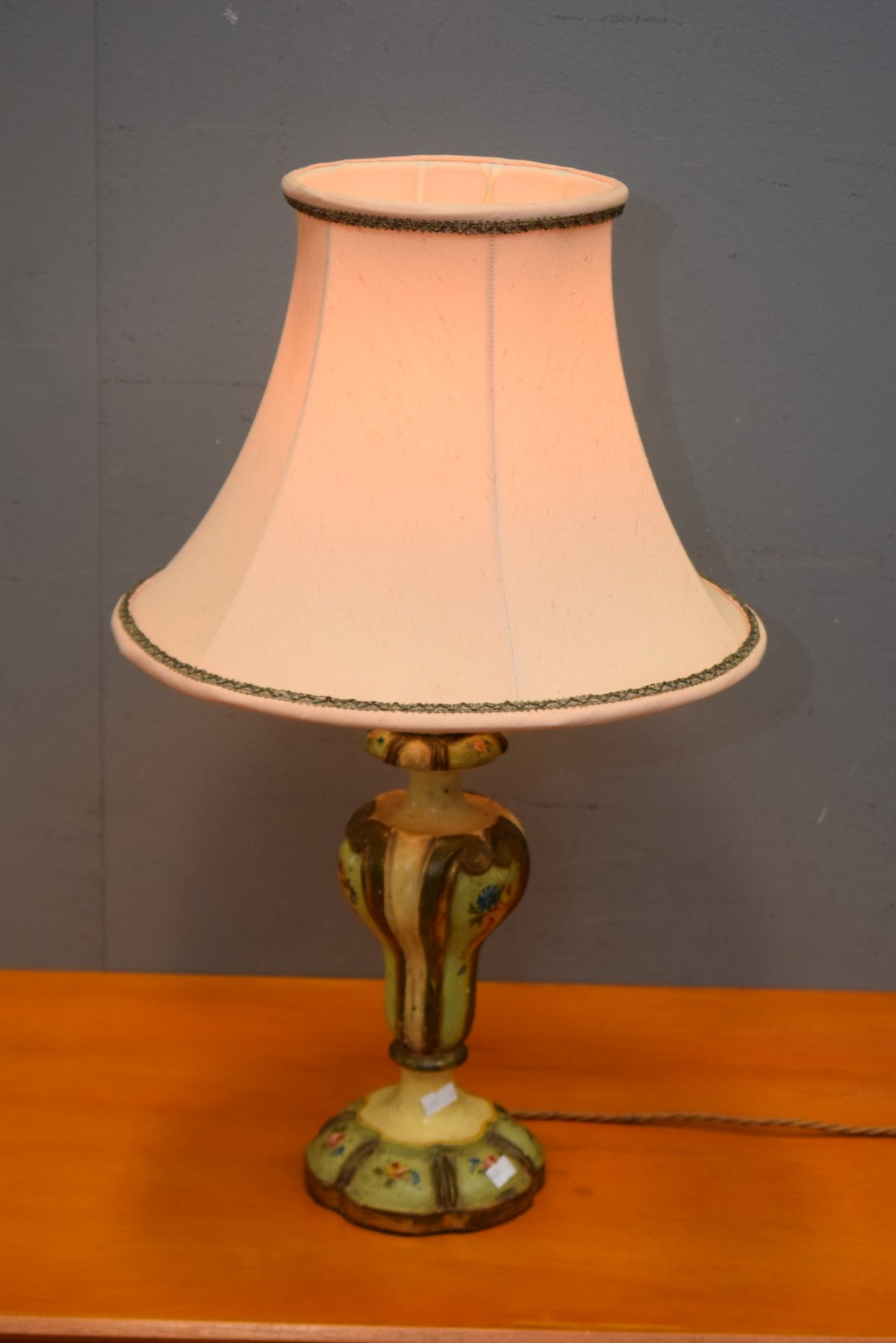 A 1920S ITALIAN GILTWOOD FLORENTINE FLORAL DECORATED TABLE LAMP WITH FABRIC SHADE (61H CM)