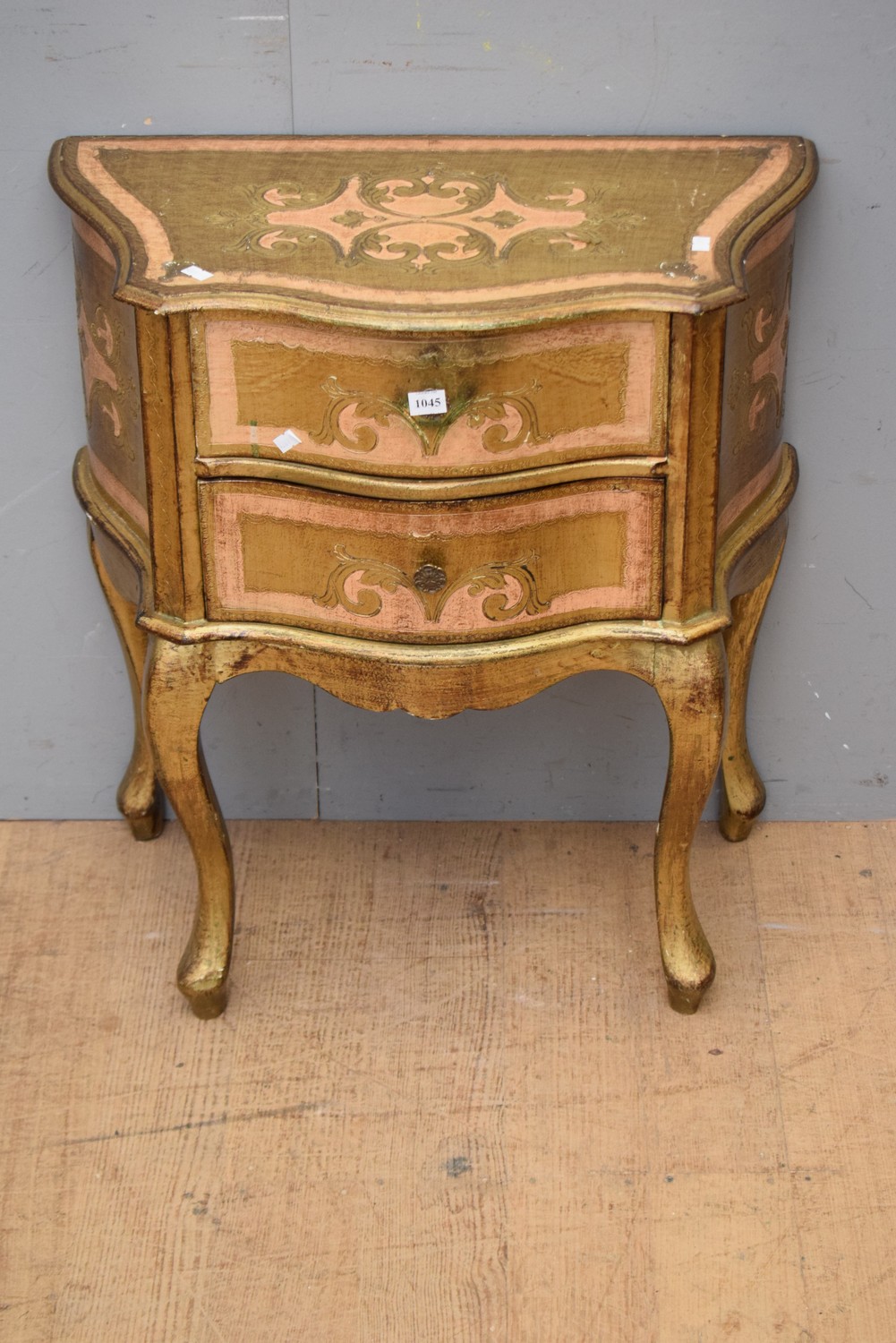 A 1920S ITALIAN FLORENTINE GILTWOOD TWO DRAWER SIDE CABINET (65H X 59W X 32D CM)