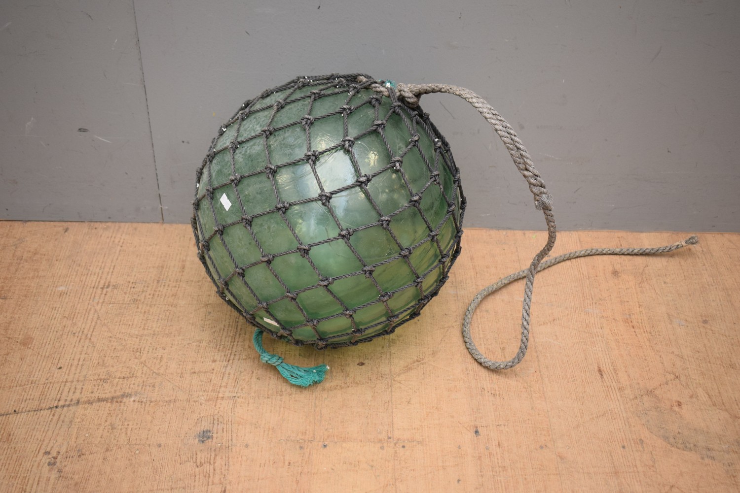 A LARGE 1940S GLASS AND GREEN ROPE COVERED SHIPS / FISHING FLOAT / BUOY (APPROX 43D CM)