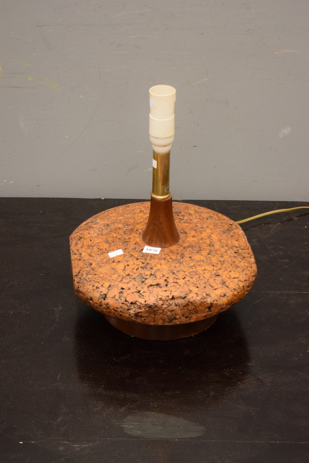 A 1950S RETRO BRASS, CARVED CORK AND WOODEN TABLE LAMP (38H CM) (LEONARD JOEL DELIVERY SIZE: SMALL)