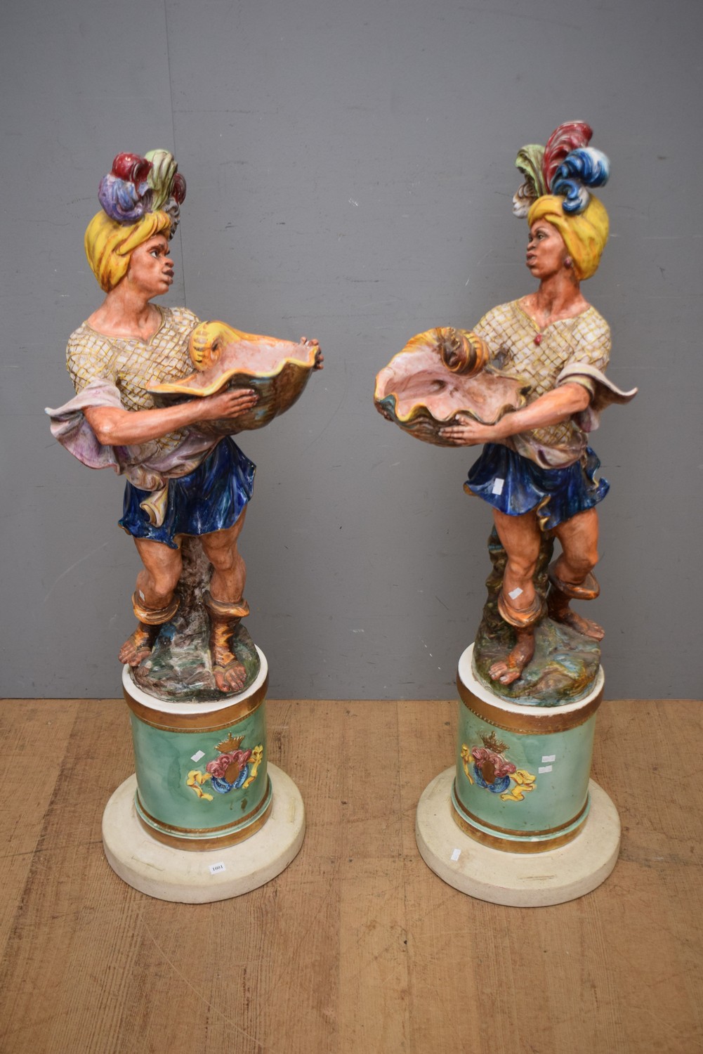 A PAIR OF 1940S ITALIAN CERAMIC BLACKAMOOR FIGURAL STANDS (REPAIR TO THE REAR BASE SECTION OF ONE FIGURE) (120H CM)