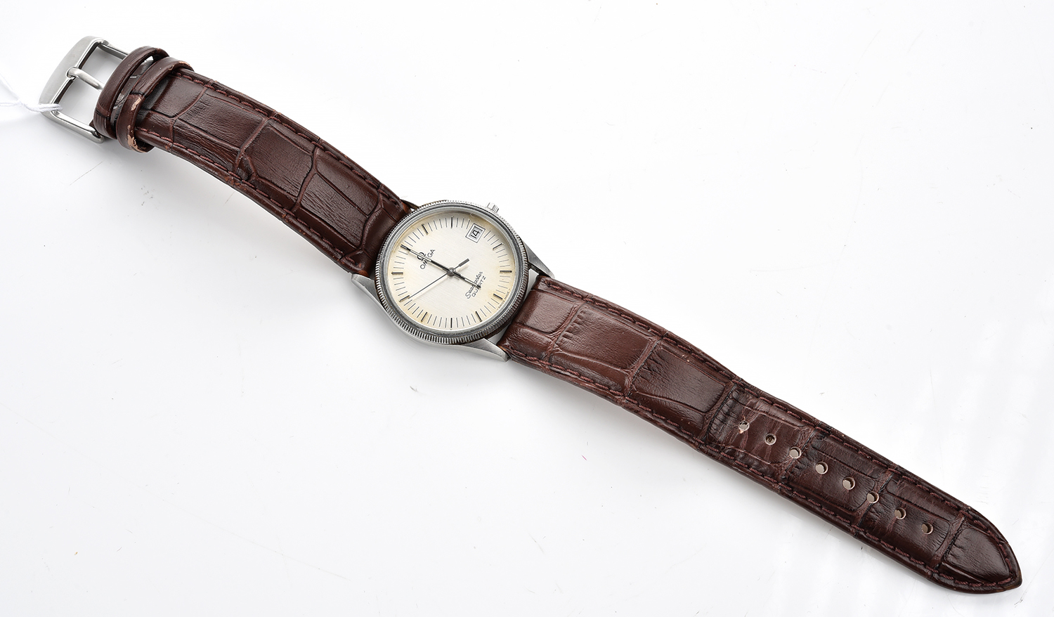 A VINTAGE QUARTZ OMEGA SEAMASTER WRISTWATCH, TO BROWN LEATHER BANDS