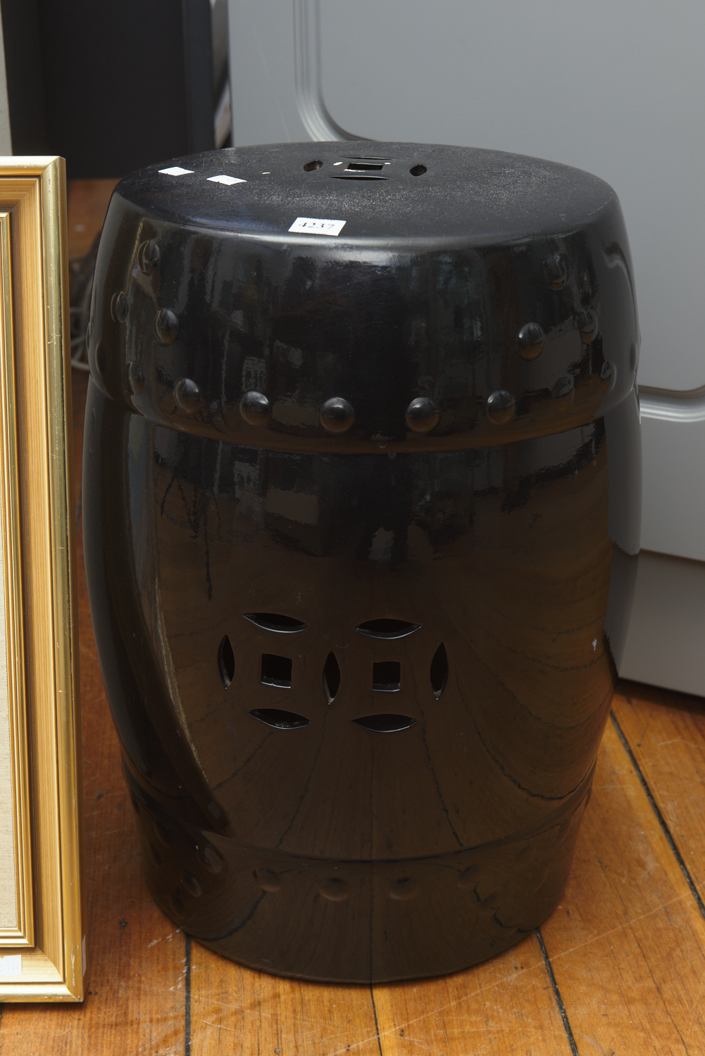 A BLACK GLAZED CERAMIC BARREL STOOL