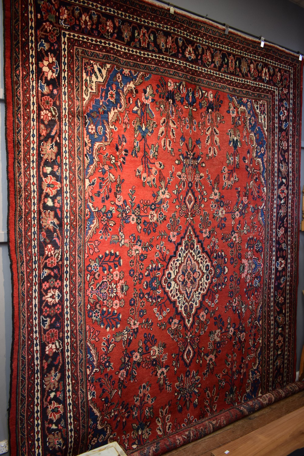 A PERSIAN HAMADAN CARPET. 100% WOOL. SOLID & DENSE PILE. HAND-KNOTTED VILLAGE WEAVE FROM THE HAMADAN REGION WITH DESIGN OF ELONGATED FLORAL MEDALLION & QUARTERED CORNER MEDALLIONS IN A RED FIELD OF FLORAL SPRAYS. BORDER OF PALMETTES & FLORAL MOTIFS. GALLERY INVENTORY. IN EXCELLENT CONDITION. CERTIFICATE OF AUTHENTICITY INCLUDED. SIZE: 389X268CM, ORIGIN: PERSIA – RRP: $4,800
