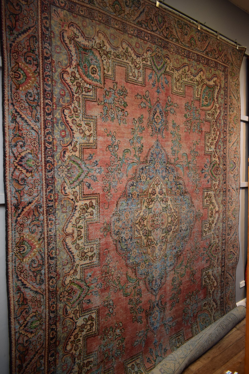 A MAGNIFICENT MODERN OVER-DYED VINTAGE PERSIAN TABRIZ CARPET. EX-GALLERY EXHIBITED. CREATED FROM A FINELY HAND-KNOTTED VINTAGE MEDALLION DESIGN PERSIAN TABRIZ CARPET, KNOTTED USING HAND SPUN WOOL ON STRONG COTTON WARPS WITH THE PILE SHORN DOWN. THE RUG IS OVER-DYED IN ROSE, BLUE, CREAM & GREEN DYES. AS SEEN IN VOGUE & HOME DÉCOR MAGAZINES. CERTIFICATE OF AUTHENTICITY INCLUDED. SIZE: 370X269CM, ORIGIN: PERSIA – RRP: $7,900