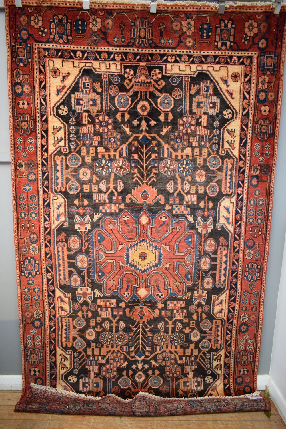 A PERSIAN NAHAVAND RUG. 100% WOOL. NATURAL DYES. HAND-KNOTTED VILLAGE WEAVE WITH TRADITIONAL DESIGN OF BOLD STYLIZED MEDALLION & CORNER MEDALLIONS CONTAINING BIRD FORMS SET WITHIN A FIELD OF VARYING FLORAL MOTIFS & BIRD FORMS. BORDER OF FLORAL MOTIFS. GALLERY INVENTORY. IN EXCELLENT CONDITION. CERTIFICATE OF AUTHENTICITY INCLUDED. SIZE: 273X156CM, ORIGIN: PERSIA – RRP: $3,800 (LARGE ITEM )