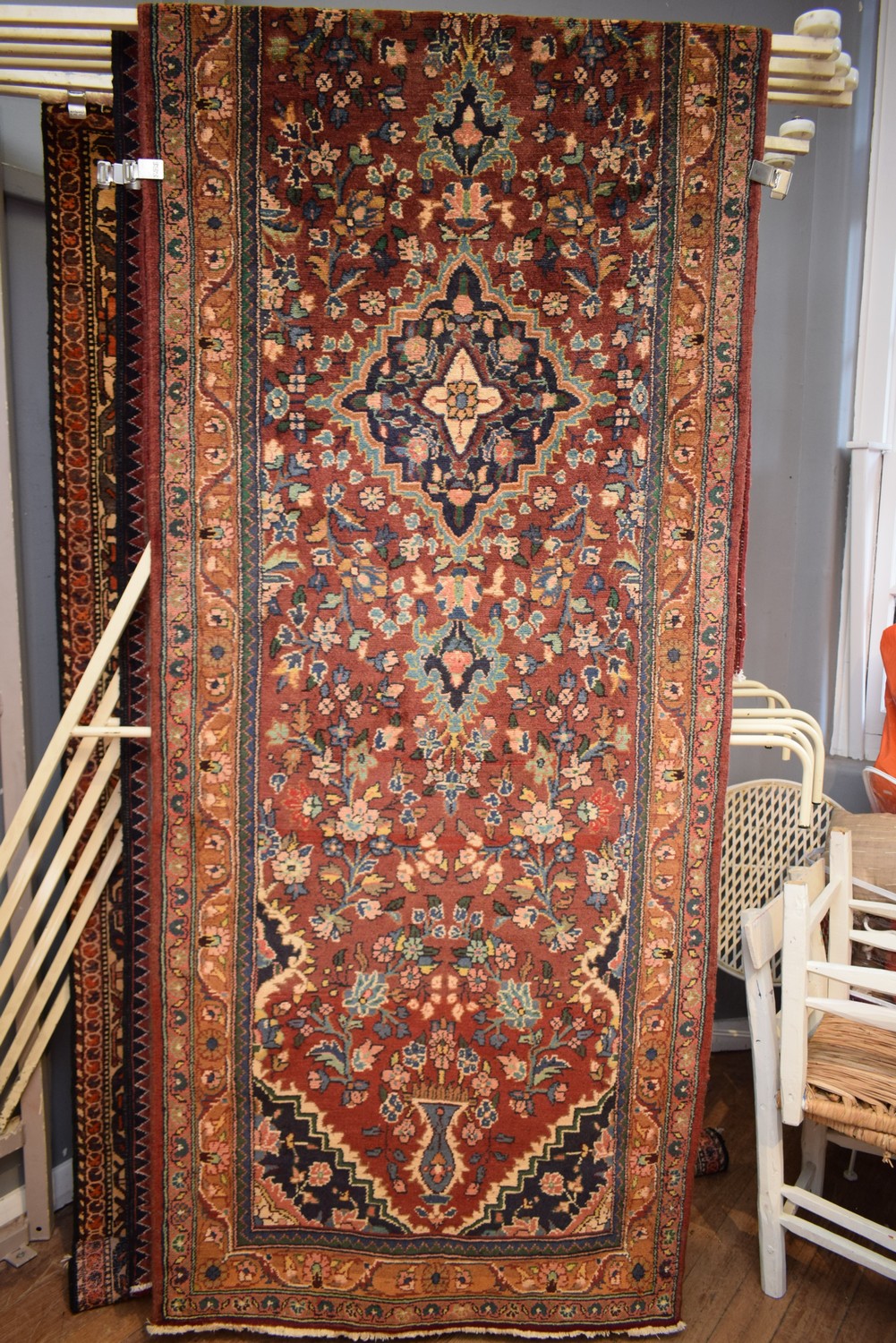A SOLID & DURABLE PERSIAN MEHRABAN HALL RUNNER. 100% WOOL. DENSE PILE. GALLERY INVENTORY. IN SUPERB CONDITION. HAND-KNOTTED VILLAGE WEAVE WITH TRADITIONAL DESIGN OF BOLD ELONGATED FLORAL MEDALLION & CORNER MEDALLIONS IN A RED FIELD OF URNS BEARING FLORAL FOLIAGE AND FLORAL SPRAYS. CERTIFICATE OF AUTHENTICITY INCLUDED. SIZE: 365X113CM, ORIGIN: PERSIA – RRP: $2,800