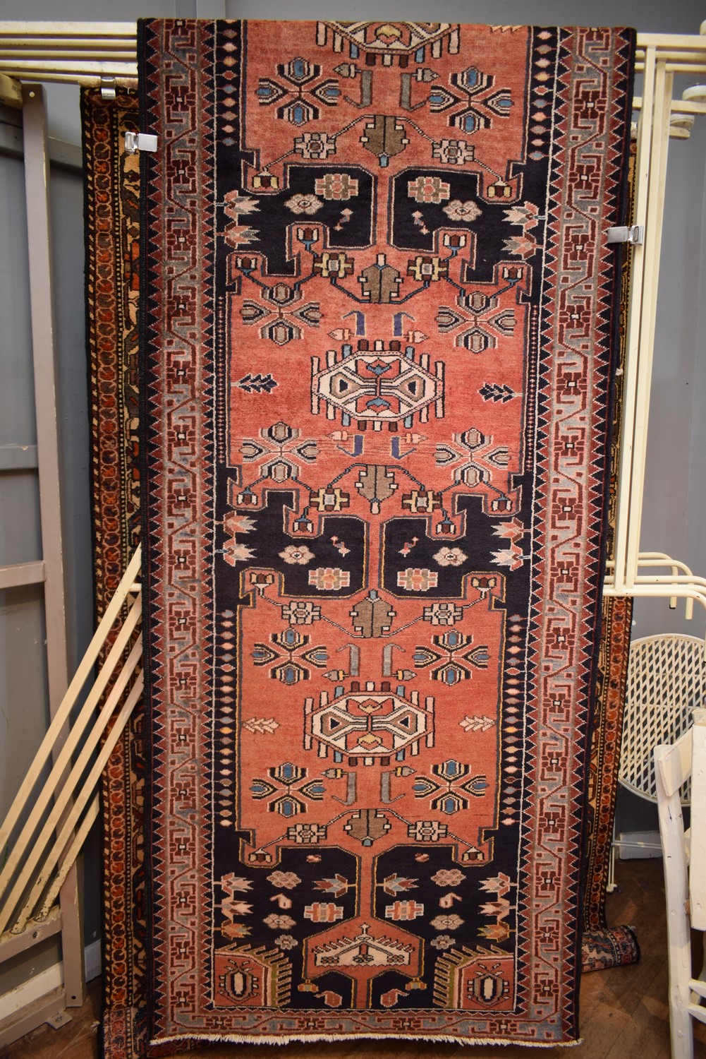 A FINE RARE PERSIAN NAHAVAND HALL RUNNER. 100% WOOL. SOLID & HARD-WEARING. FINELY HAND-KNOTTED VILLAGE WEAVE WITH RARE DESIGN OF HEXAGONAL MEDALLIONS & ANGULAR SEMI-MEDALLIONS & CORNER MEDALLIONS IN A CORAL TONED FIELD OF GEOMETRIC & FLORAL PATTERNS. BORDER OF FLOWER HEADS. GALLERY INVENTORY. IN EXCELLENT CONDITION. CERTIFICATE OF AUTHENTICITY INCLUDED. SIZE: 320X110CM, ORIGIN: PERSIA – RRP: $2,200 (MEDIUM ITEM)