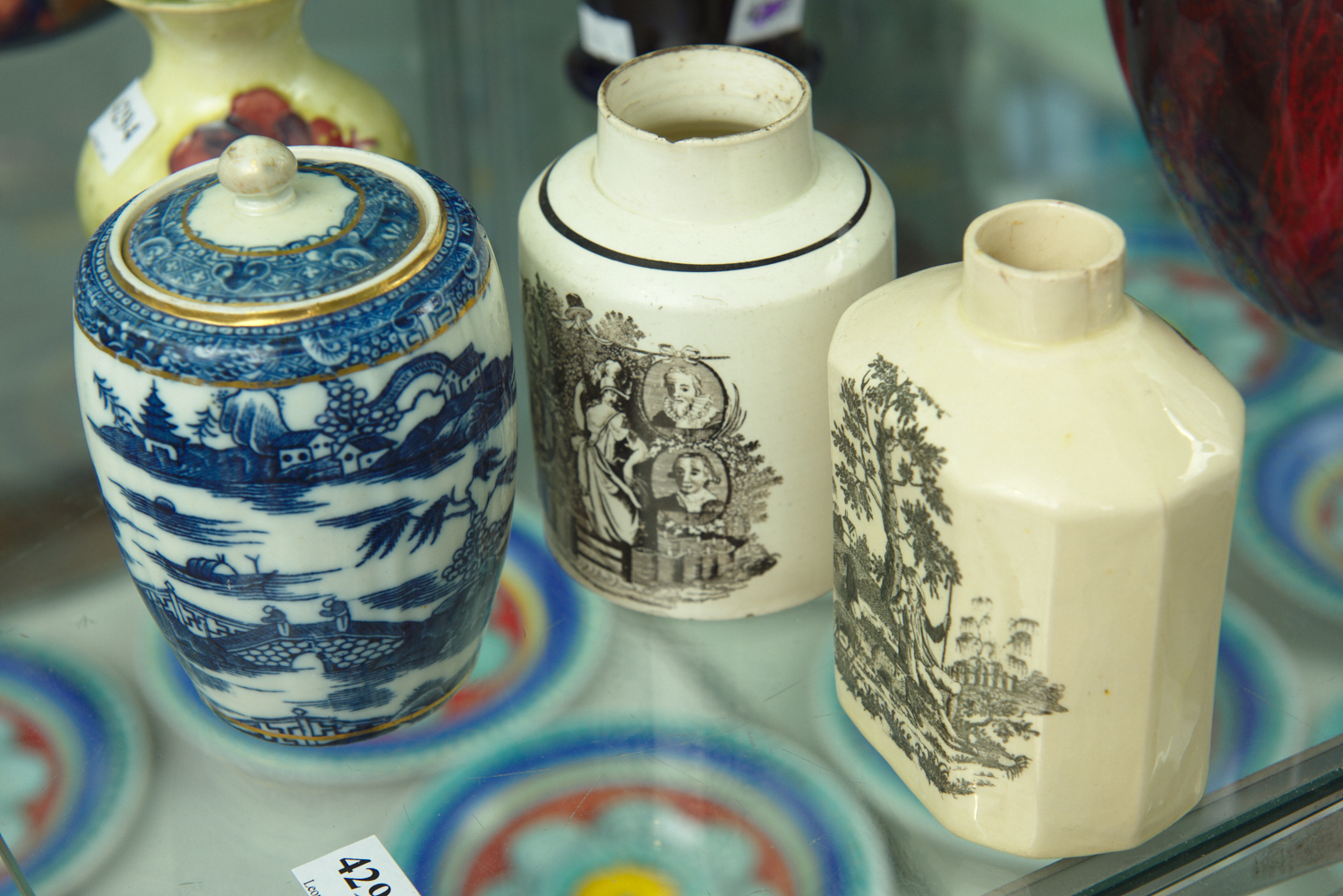 FACETED CADDY: VERTICAL AND DIAGONAL HAIRLINE TO THE NECK; WEAR TO THE TRANSFER DECORATION