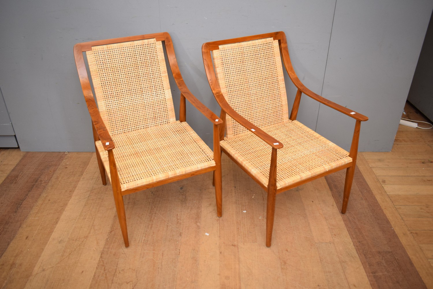 A PAIR OF TEAK AND RATTAN ARMCHAIRS (95H X 61W X 79D CM) (LARGE ITEM)