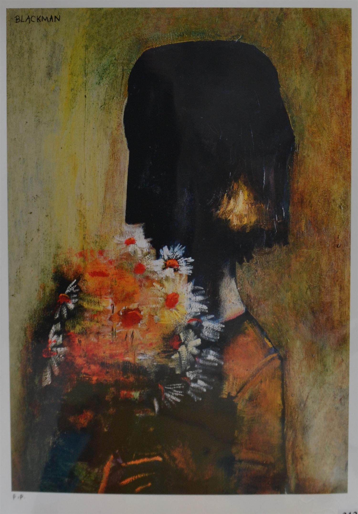 A CHARLES BLACKMAN PRINT, HOLDING FLOWERS, DIGITAL PRINT P/P, UNSIGNED, 43 X 33CM, UNFRAMED BUT BACKED AND WRAPPED FOR PROTECTION, CONDITION: VERY GOOD NO FAULTS, LEONARD JOEL DELIVERY SIZE: SMALL