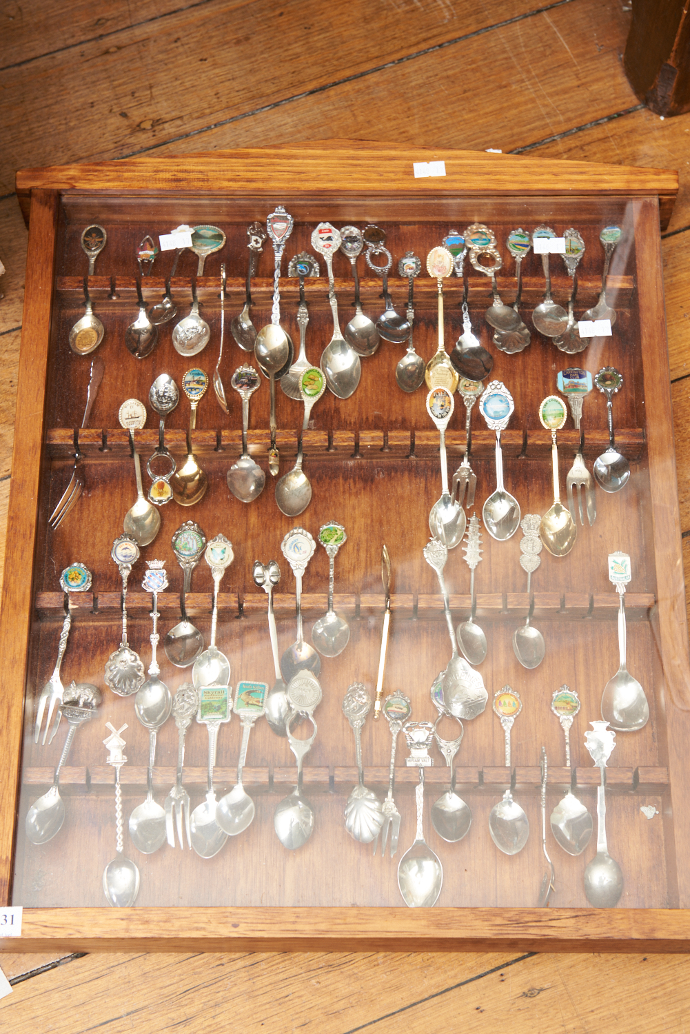A LARGE COLLECTION OF SOUVENIR SPOONS IN WALL HANGING GLAZED BOX FRAME, LEONARD JOEL LOCAL DELIVERY SIZE: SMALL