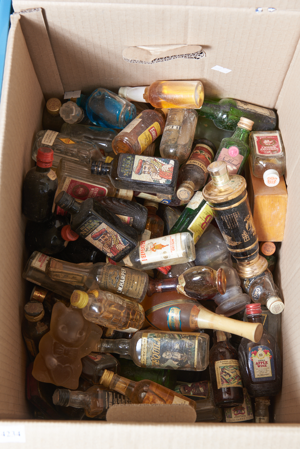 A BOX CONTAINING ASSORTED MINIATURE LIQUEURS (SOME OPEN), LEONARD JOEL LOCAL DELIVERY SIZE: SMALL