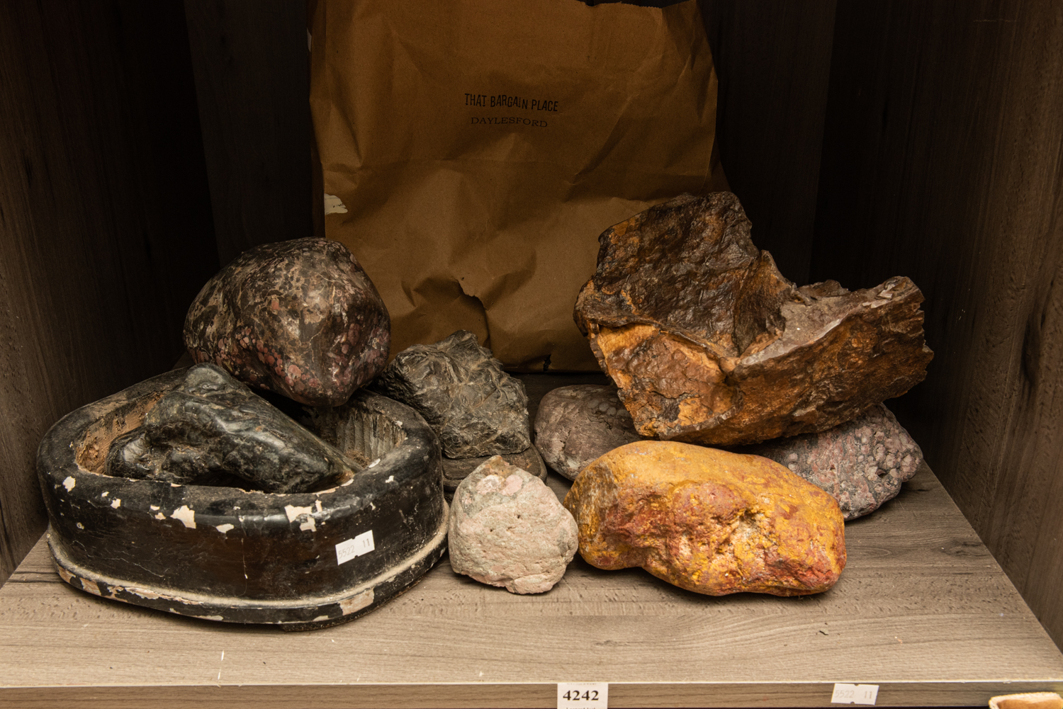 A SHELF OF ASSORTED ROCK SPECIMENS, LEONARD JOEL LOCAL DELIVERY SIZE: SMALL