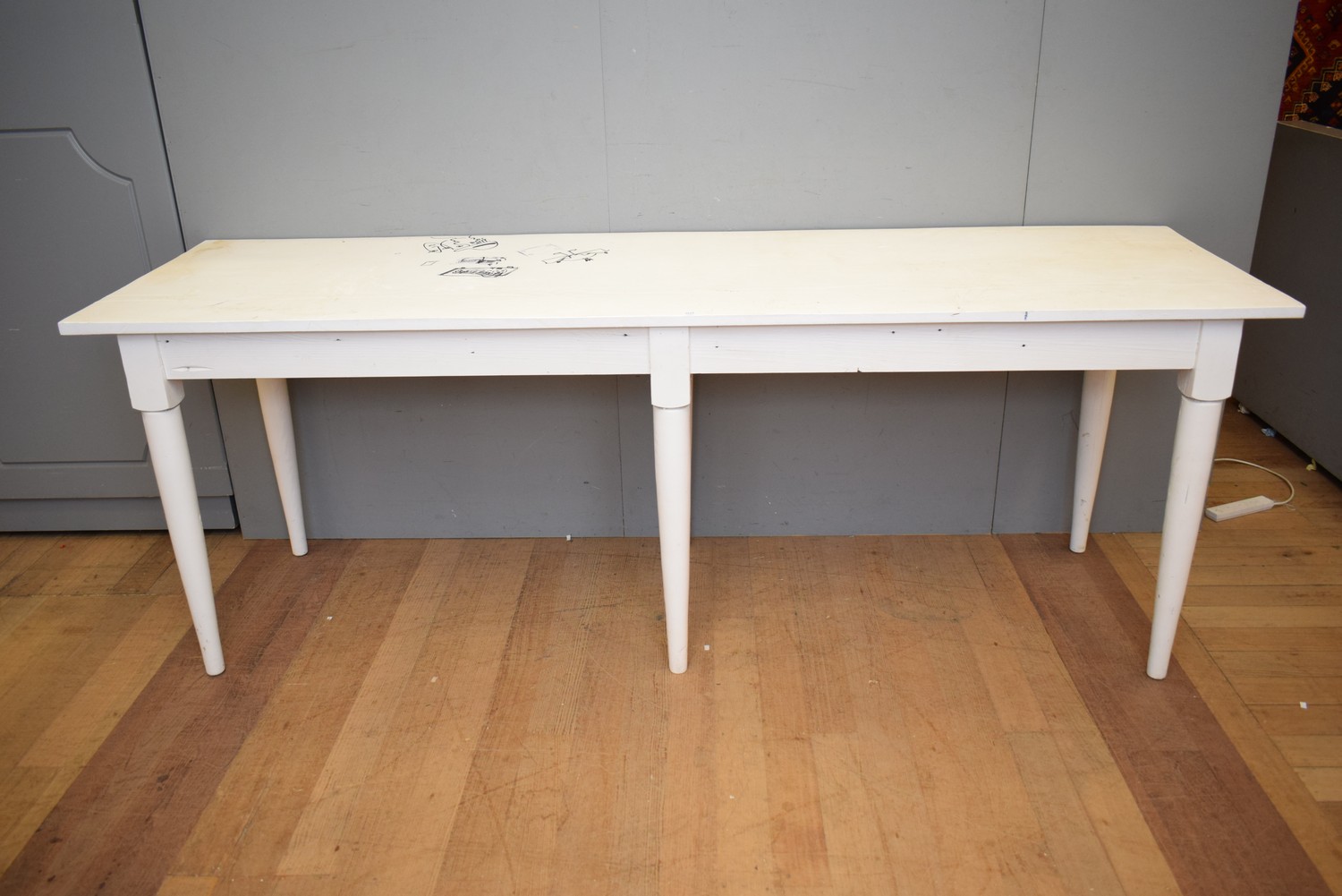 A LARGE WHITE PAINTED WORK BENCH (A/F) (94H X 259W X 76D CM) (X-LARGE ITEM)
