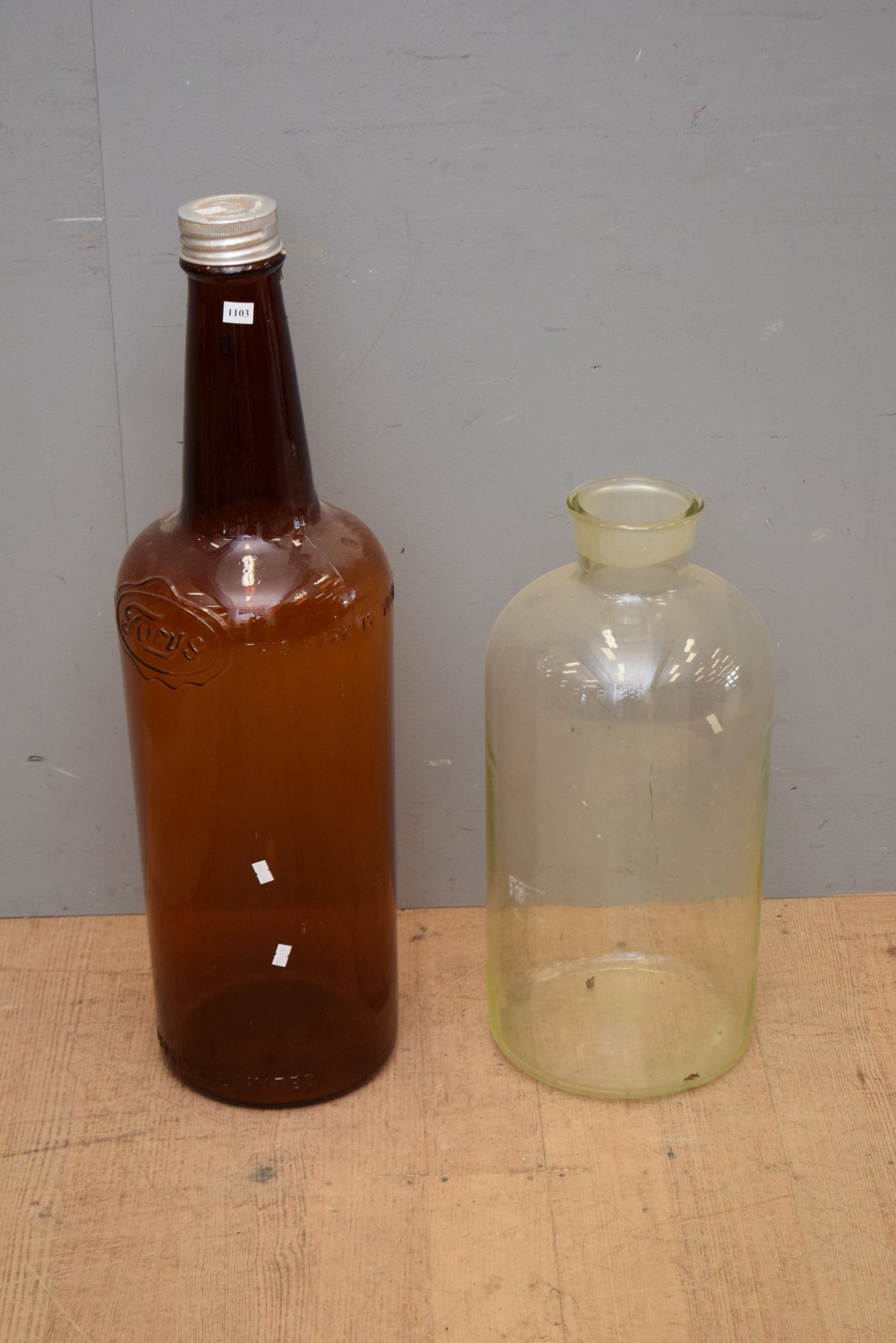 A LARGE BROWN 'TORYS' BOTTLE AND A CLEAR BOTTLE (A/F) (LARGEST BOTTLE 83H CM) (LEONARD JOEL DELIVERY SIZE: SMALL)
