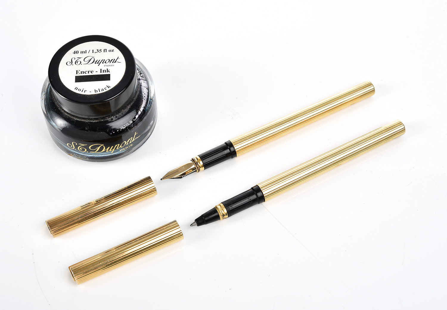 A GENTLEMAN'S VINTAGE WRITING SET BY DUPONT, COMPRISING A BALL POINT PEN (IN BLACK), A FOUNTAIN PEN, THE NIB IN 18CT GOLD, AND A BLACK INKWELL