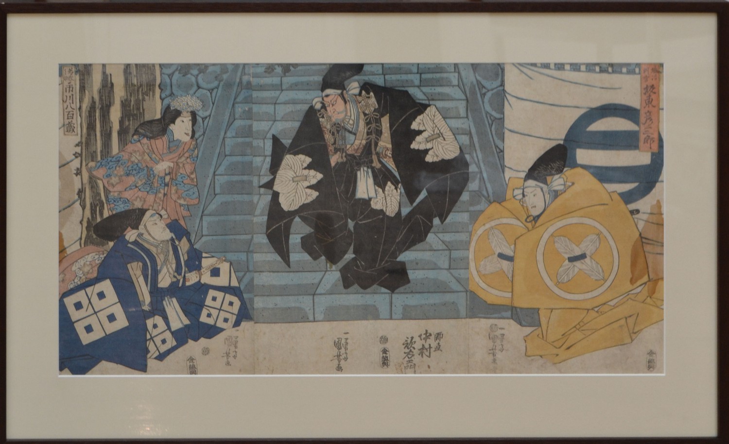 KUNIYOSHI, ACTOR TRIPTYCH, JAPANESE WOODBLOCK PRINT, 36 X 70CM FRAME SIZE: 52 X 85CM CONDITION: LIGHT DISCOLOURATION AND CREASING, CONSISTENT WITH AGE. LEONARD JOEL DELIVERY SIZE: LARGE