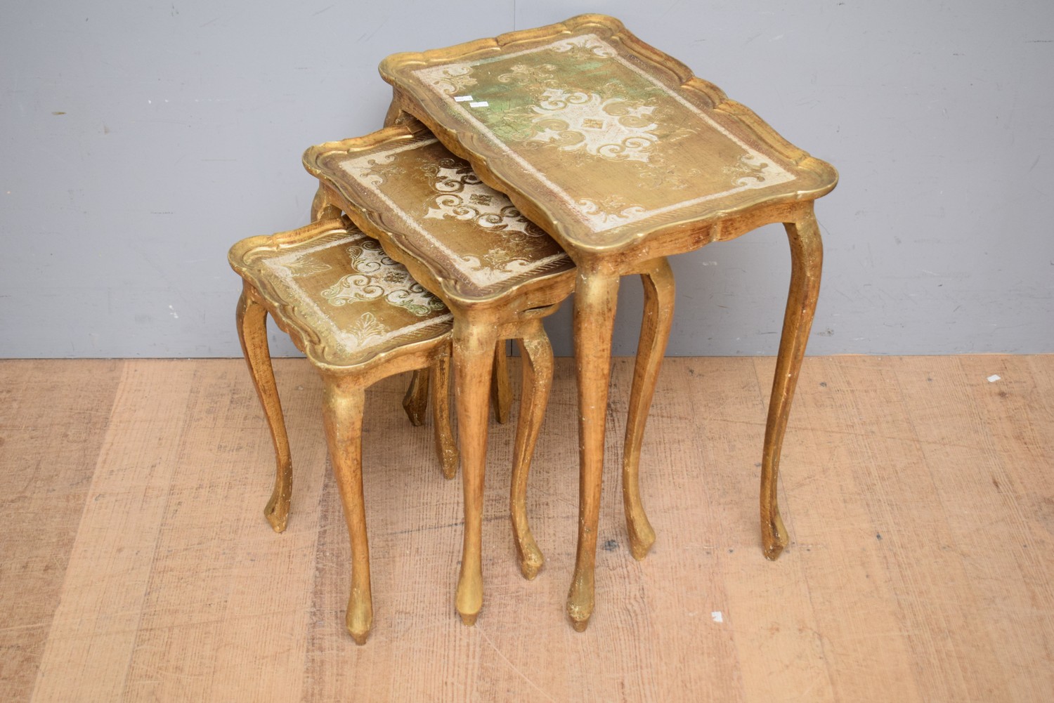 A NEST OF THREE 1900S ITALIAN FLORENTINE GILTWOOD TABLES (LARGEST 58H x 55W x 35D CM) (LEONARD JOEL DELIVERY SIZE: SMALL)