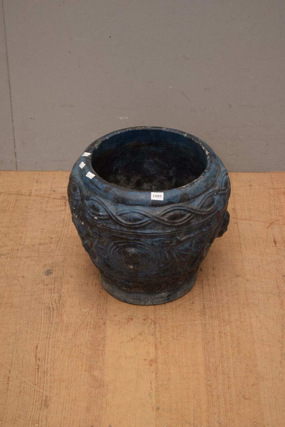 A 1920S BLUE GLAZED CONCRETE GARDEN POT WITH FIGURAL MOTIFS TO SIDE (33H X 37D CM) (MEDIUM ITEM)