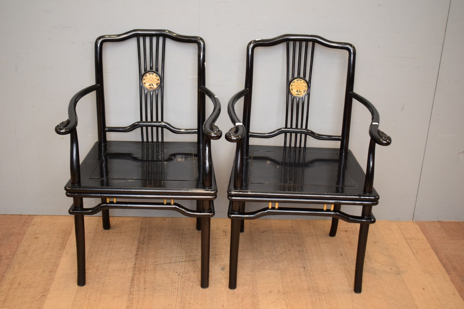 A PAIR OF BLACK LACQUERED CHINESE EBONISED ARMCHAIRS (96H X 63W X 60D CM) (MEDIUM ITEM)