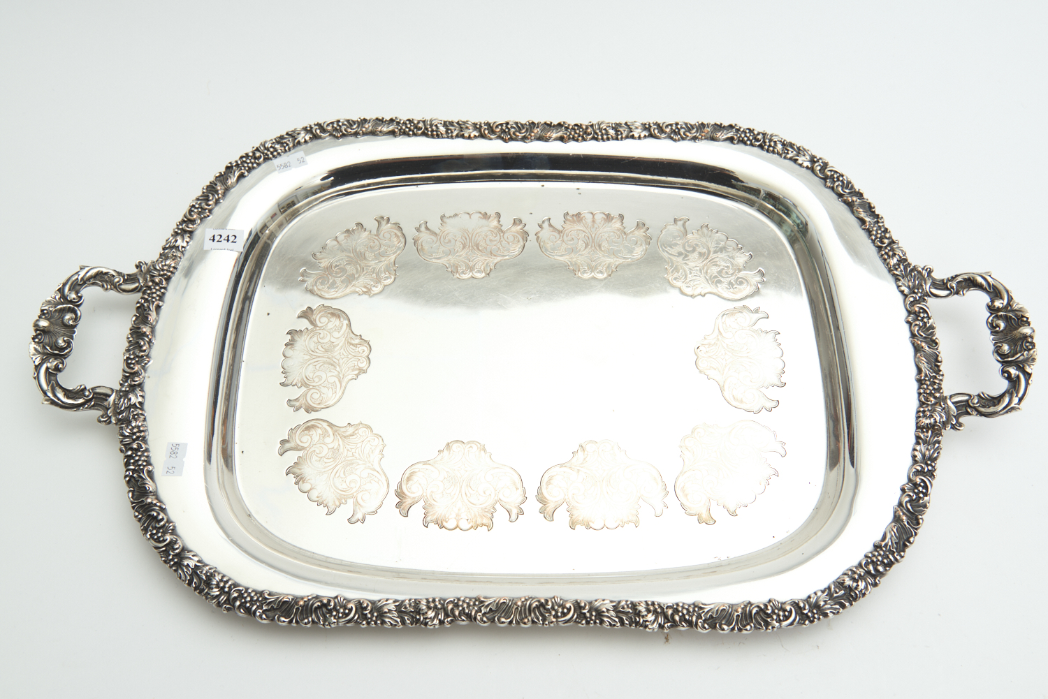 A LARGE SILVERPLATE ON COPPER TWO HANDLED FLORAL AND FOLIATE DECORATED RECTANGULAR SERVING TRAY, 60 X 37CM, LEONARD JOEL LOCAL DELIVERY SIZE: SMALL