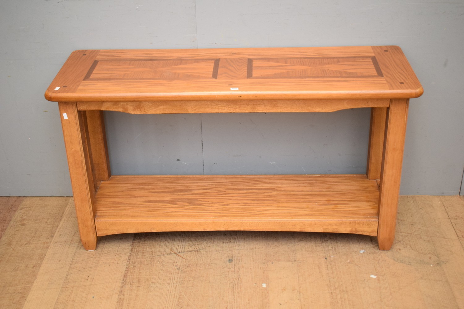 A TIMBER INLAID TWO TIER HALL CONSOLE (70H x 127W x 43D CM) (LARGE ITEM)