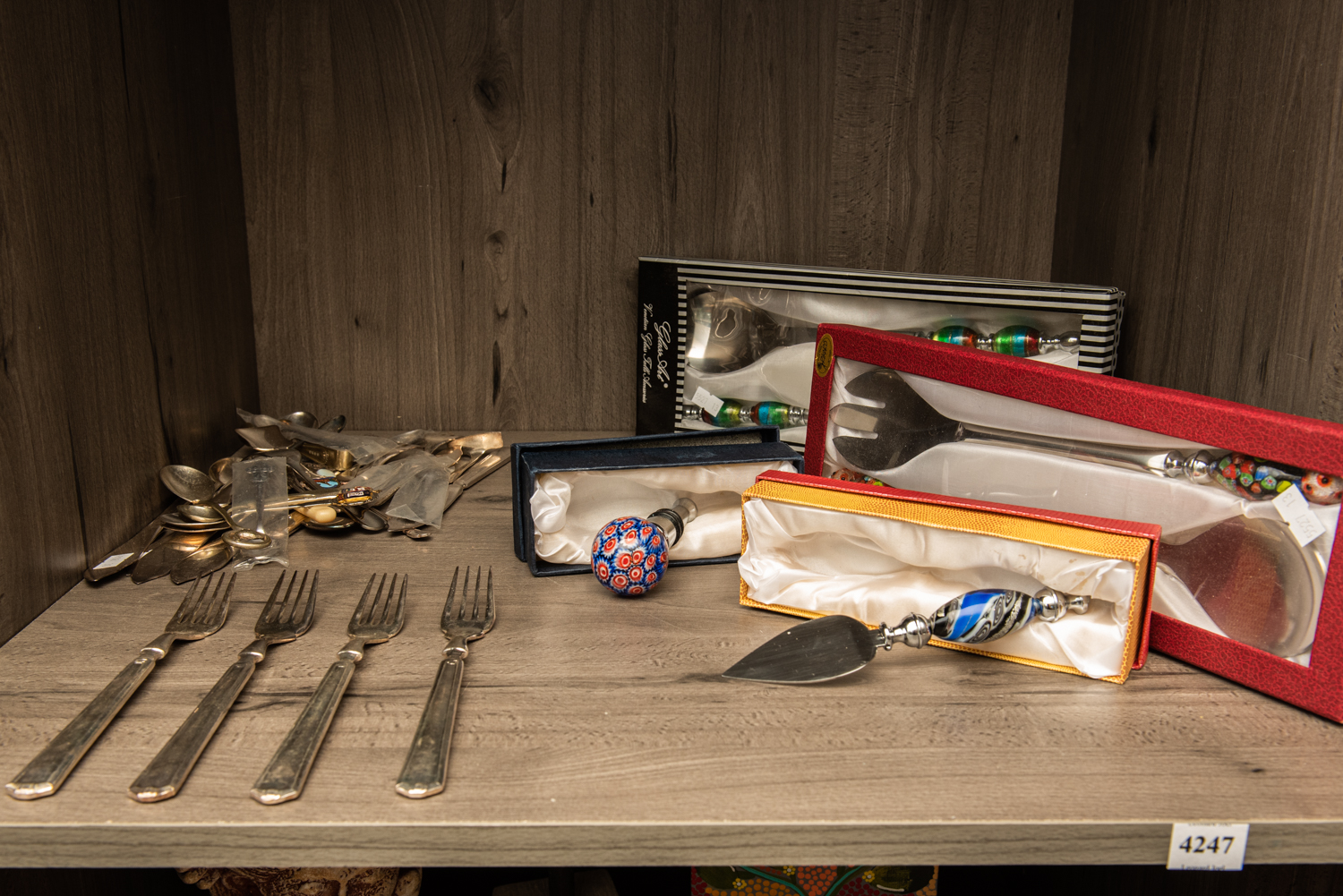 TWO SERVING SETS, A BUTTER KNIFE AND A WINE STOPPER WITH DECORATIVE GLASS HANDLES, LEONARD JOEL LOCAL DELIVERY SIZE: SMALL