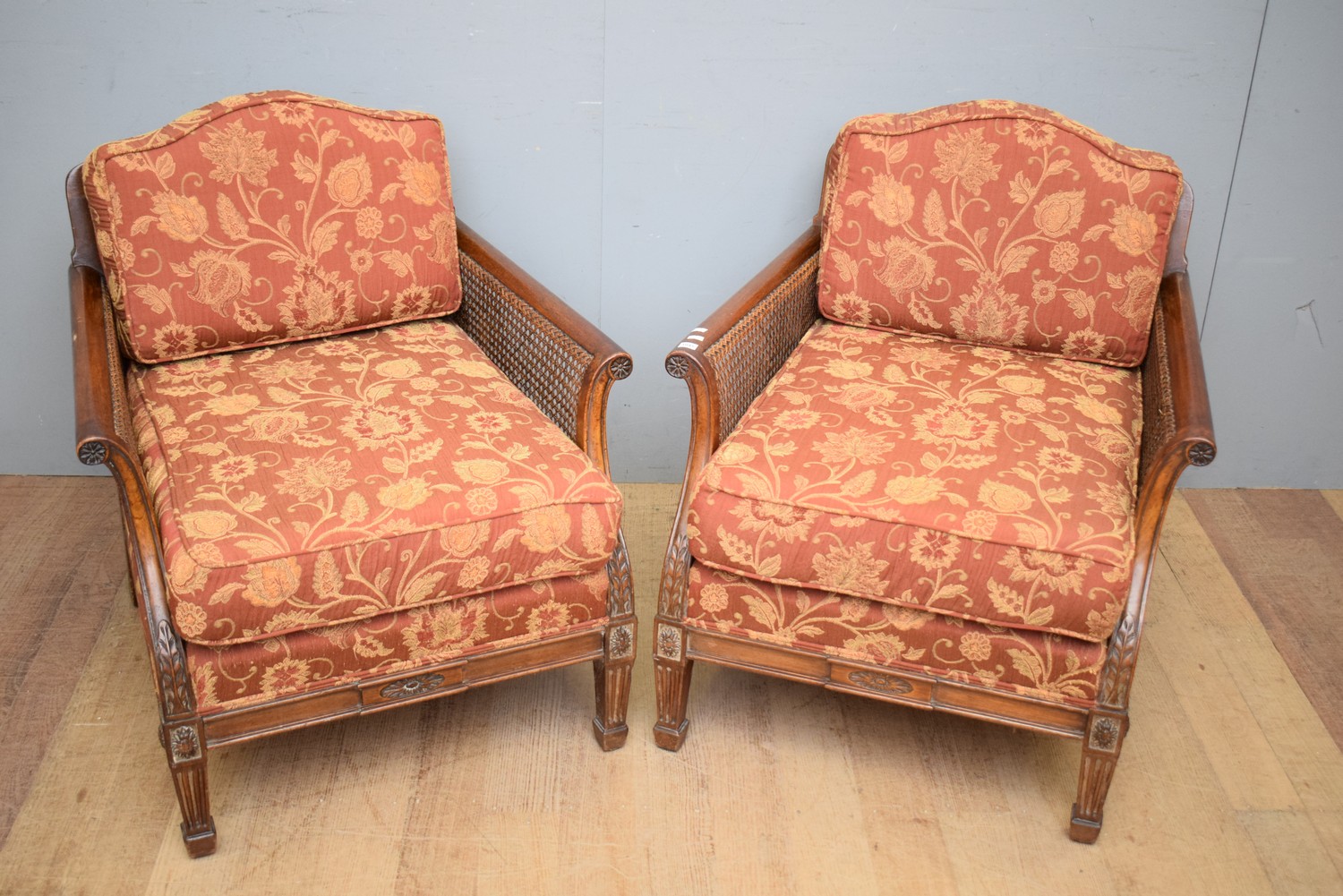 A PAIR OF FRENCH STYLE UPHOLSTERED ARMCHAIRS WITH RATTAN SEATS (83H X 76W X 86D CM) (LEONARD JOEL DELIVERY SIZE: LARGE)