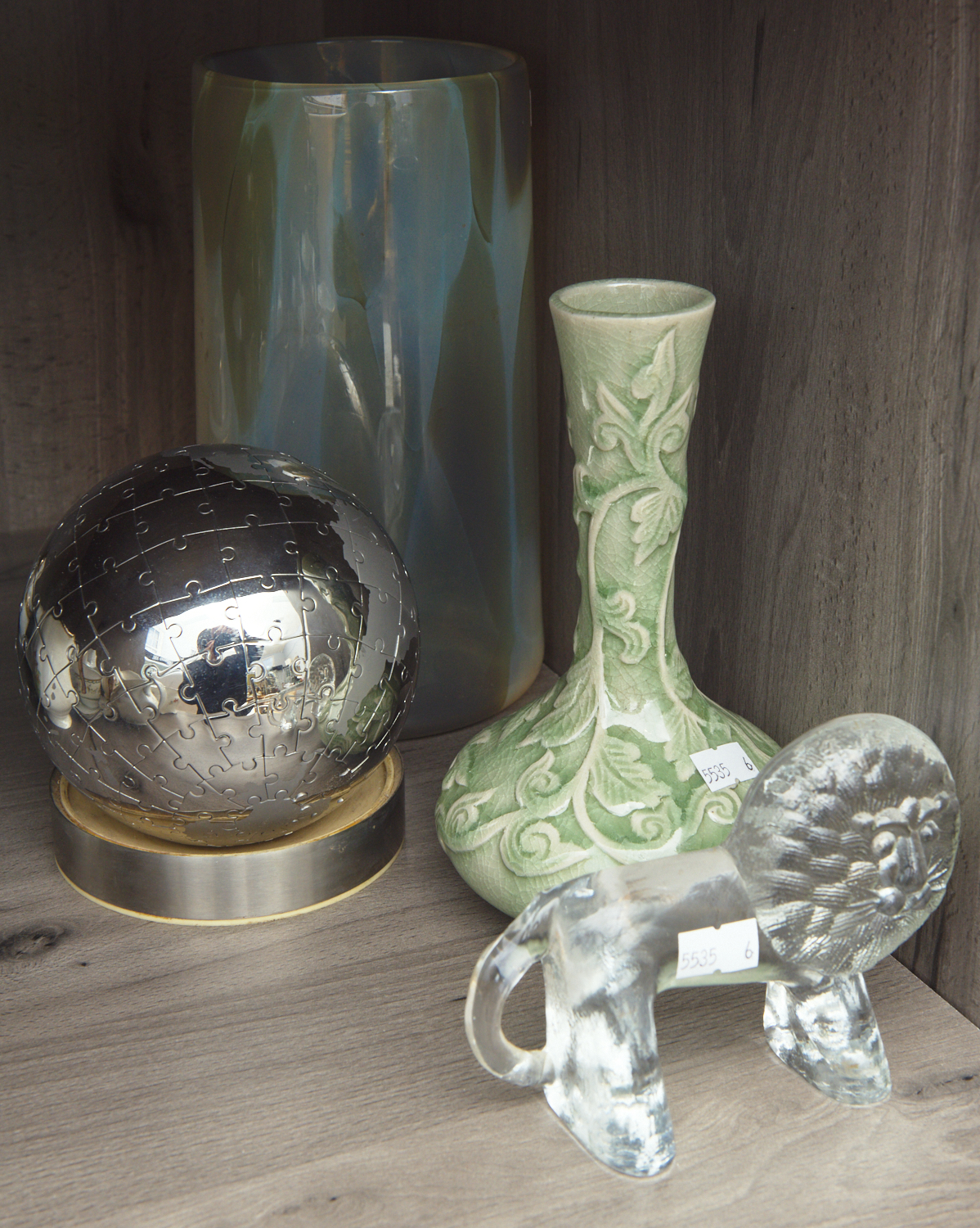 A GREEN GLASS VASE, A GLASS LION, A GREEN GLAZED BOTTLE VASE AND A NOVELTY GLOBE