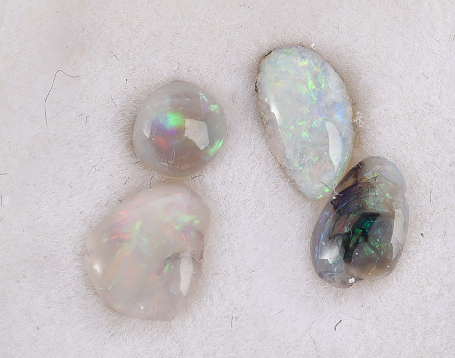FOUR LOOSE WHITE OPALS SPECIMEN, TOTALLING APPROXIMATELY 2CTS, SHOWING PLAY OF COLOUR WITH GREEN, YELLOW, BLUE AND ORANGE FLASHES