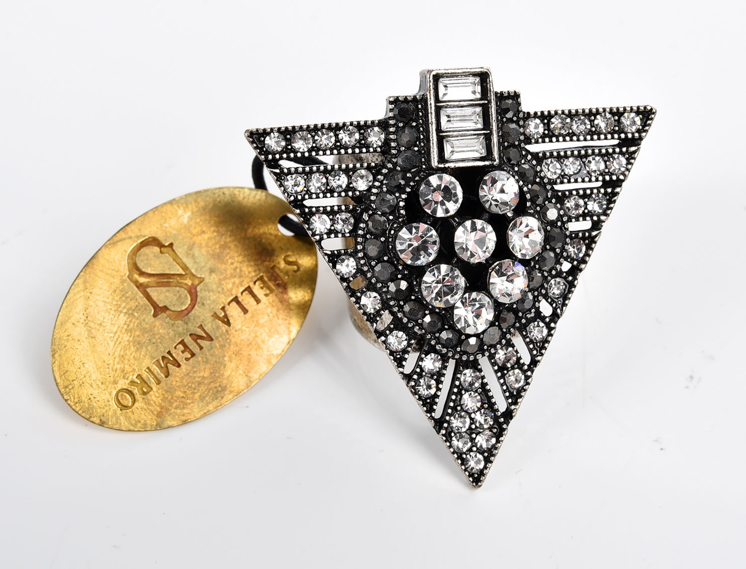 A PASTE SET TRIANGULAR COSTUME RING BY STELLA NEMIRO, WITH POUCH (AS NEW), SIZE K (ADJUSTABLE)