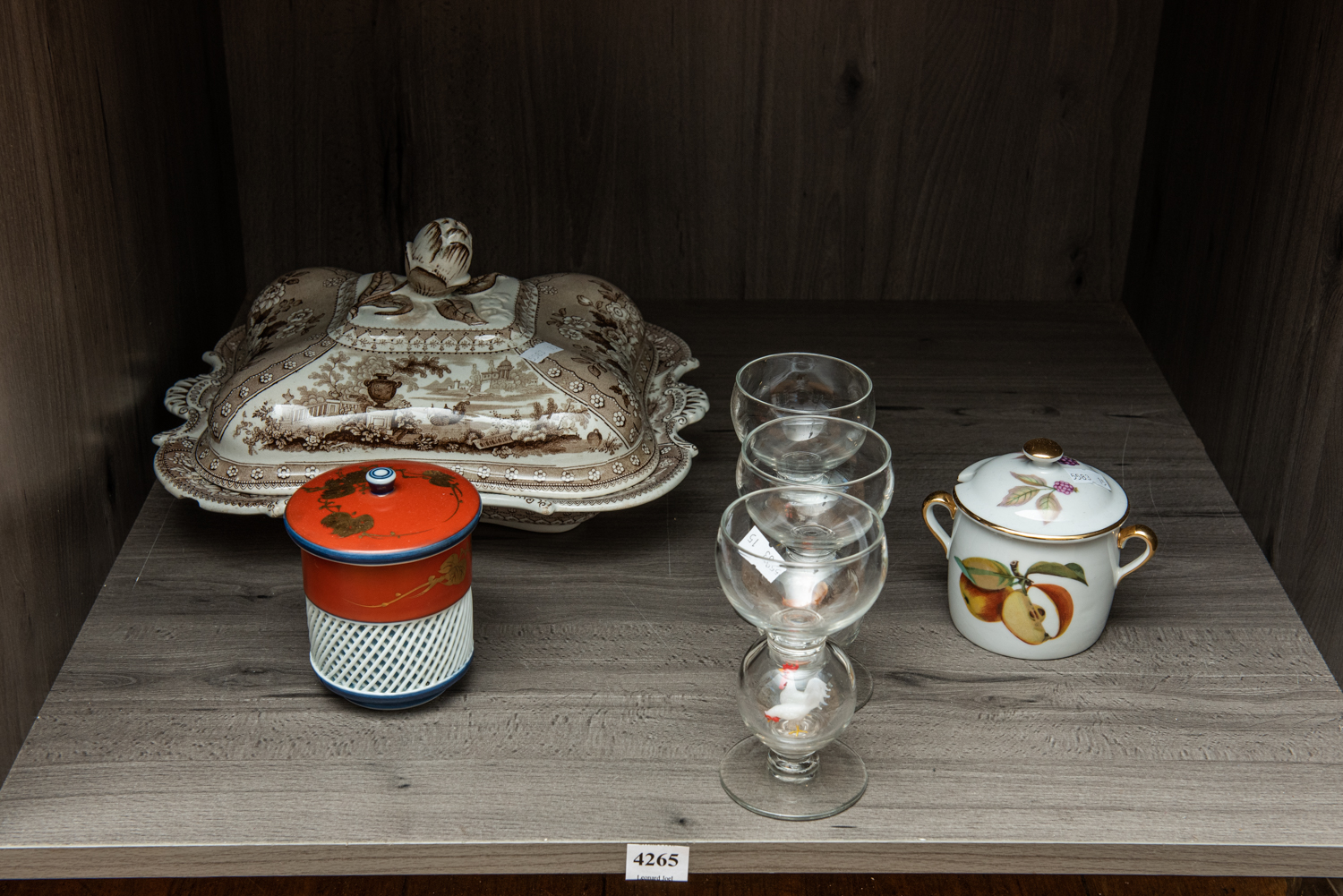 A GROUP OF VINTAGE ITEMS INCLUDING TRANSFERWARE TUREEN (A/F), GLASSES, JAPANESE BASKETWARE CERAMIC VESSEL AND ROYAL WORCESTER LIDDED JAR, LEONARD JOEL LOCAL DELIVERY SIZE: SMALL
