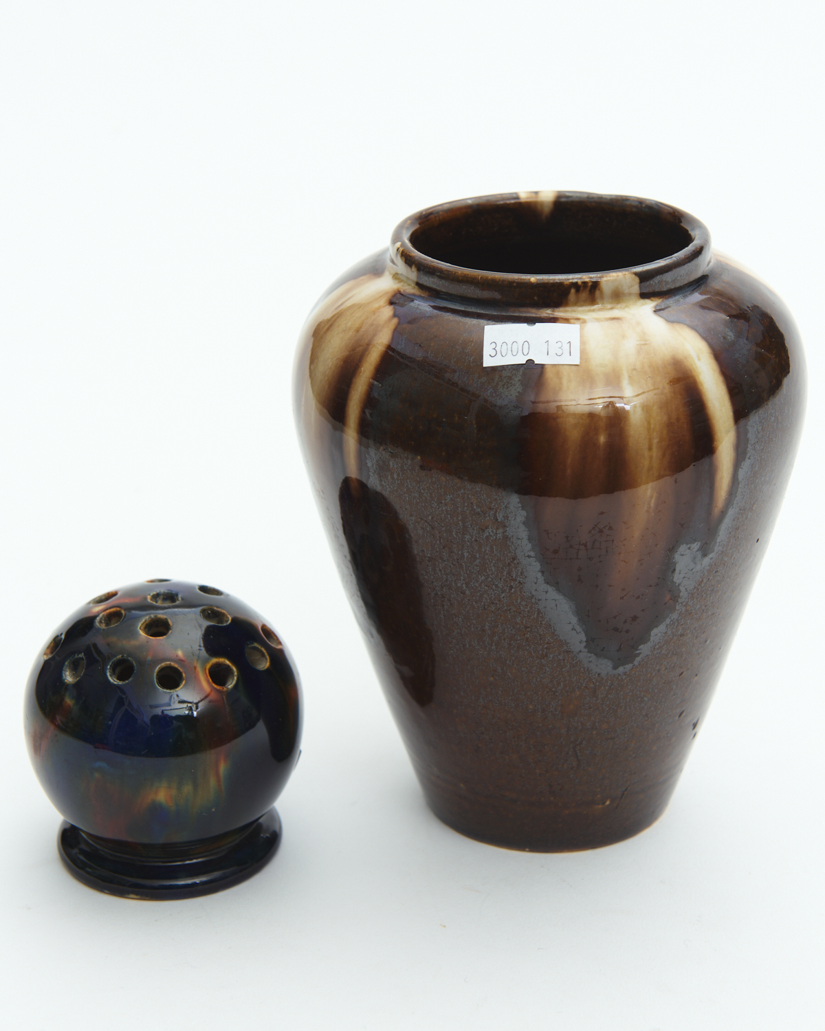TWO PIECES OF AUSTRALIAN POTTERY INCLUDING BROWN GLAZE VASE H.16CM AND MCHUGH TASMANIA CERAMIC FROG IN BLUE AND RED GLAZE
