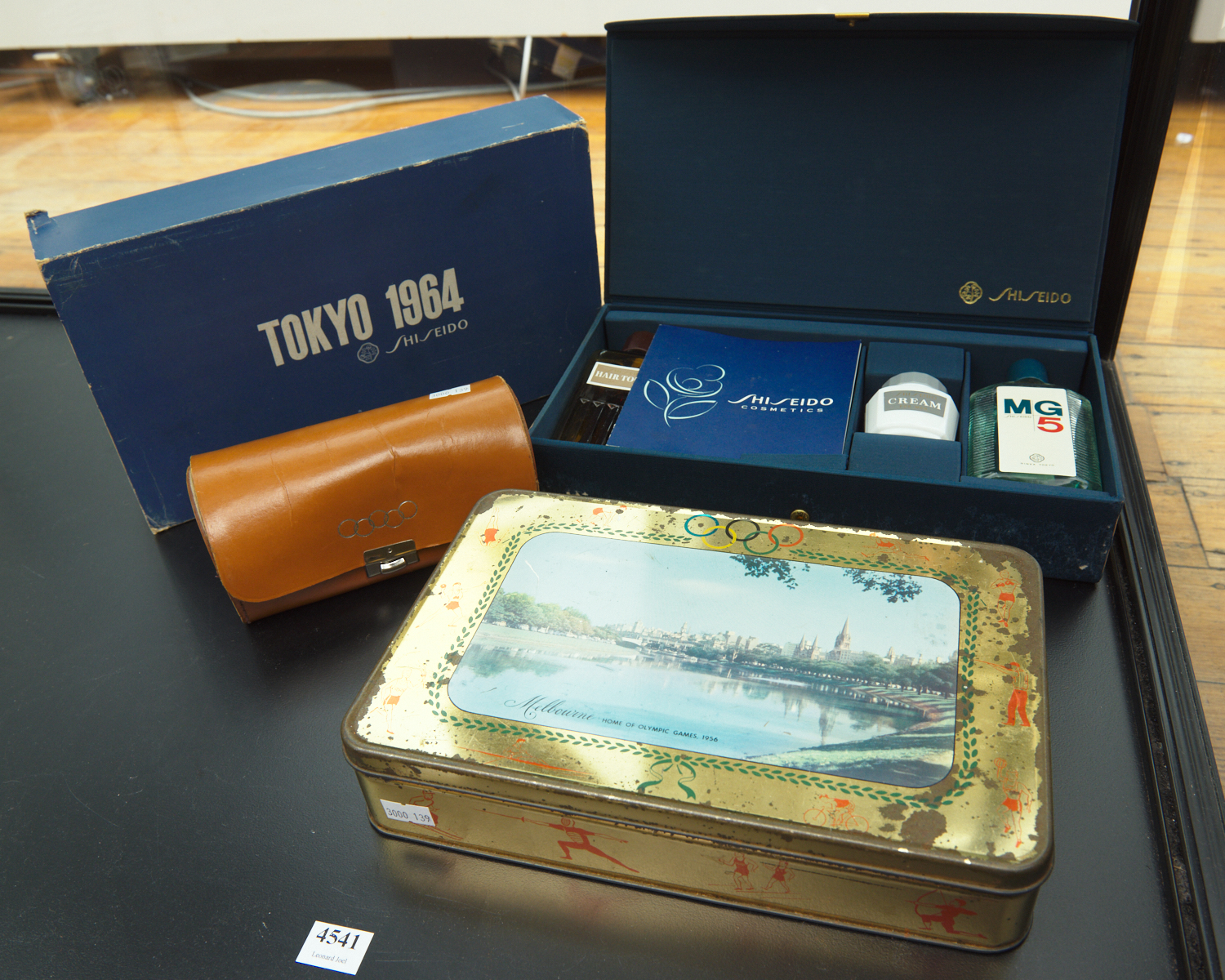 A GROUP OF OLYMPIC MEMORABILIA ITEMS INCLUDING 1964 SUMMER OLYMPIC GAMES TOKYO BATHROOM SET BY SHISEIDO, 1964 SUMMER OLYMPICS TOKYO SHOE SHINE SET AND 1956 SUMMER OLYMPICS MELBOURNE TIN, LEONARD JOEL DELIVERY SIZE: SMALL