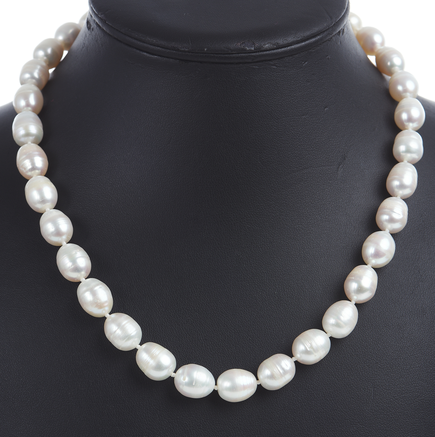A STRAND OF FRESHWATER PEARLS TO AN OVAL CLASP IN STERLING SILVER, THE PEARLS MEASURING 9MM TO 12MM, LENGTH 480MM