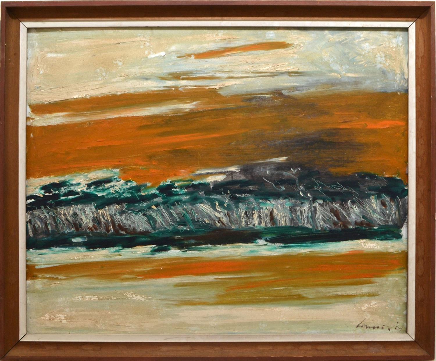 KEVIN CONNOR, GIPPSLAND LAKES II (ORANGE) 1964, OIL ON BOARD, 60 X 75CM, FRAME: 70 X 85CM, CONDITION: SURFACE CRACKING AND PIGMENT LOSS THROUGHOUT, SURFACE DIRT EVIDENT IN TOP AND BOTTOM OF WORK, BOARD SITS LOOSE IN THE FRAME. RESTORATION AND REFRAMING IS RECOMMENDED, LEONARD JOEL DELIVERY SIZE: MEDIUM