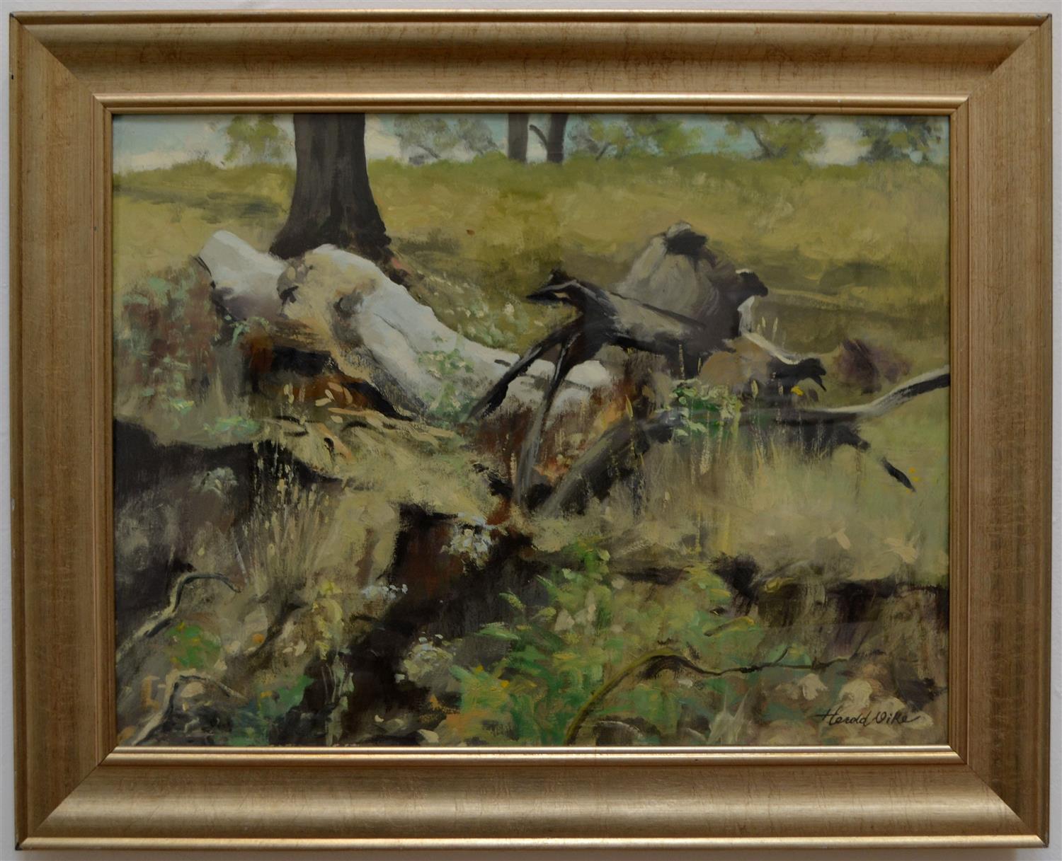 HAROLD VIKE, LANDSCAPE, OIL ON BOARD, 60 X 80CM, FRAME: 78 X 99CM, CONDITION: HAIRLINE CRACKING THROUGHOUT, SPOTS OF FOREIGN MATTER THROUGHOUT, LEONARD JOEL DELIVERY SIZE: LARGE