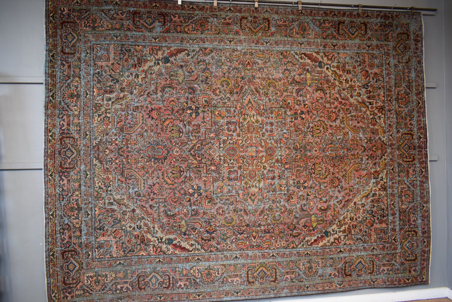 A MAGNIFICENT CONTEMPORARY VINTAGE PERSIAN TABRIZ CARPET. EX-GALLERY EXHIBITED. CREATED FROM A FINELY HAND-KNOTTED VINTAGE MEDALLION DESIGN PERSIAN TABRIZ CARPET, KNOTTED USING HAND SPUN WOOL ON STRONG COTTON WARPS WITH THE PILE SHORN DOWN. THE ENTIRE IN ROSE, BLUE & CREAM TONES. AS SEEN IN VOGUE & HOME DÉCOR MAGAZINES. CERTIFICATE OF AUTHENTICITY INCLUDED. SIZE: 395X300CM, ORIGIN: PERSIA – RRP: $8,500 (X-LARGE ITEM)