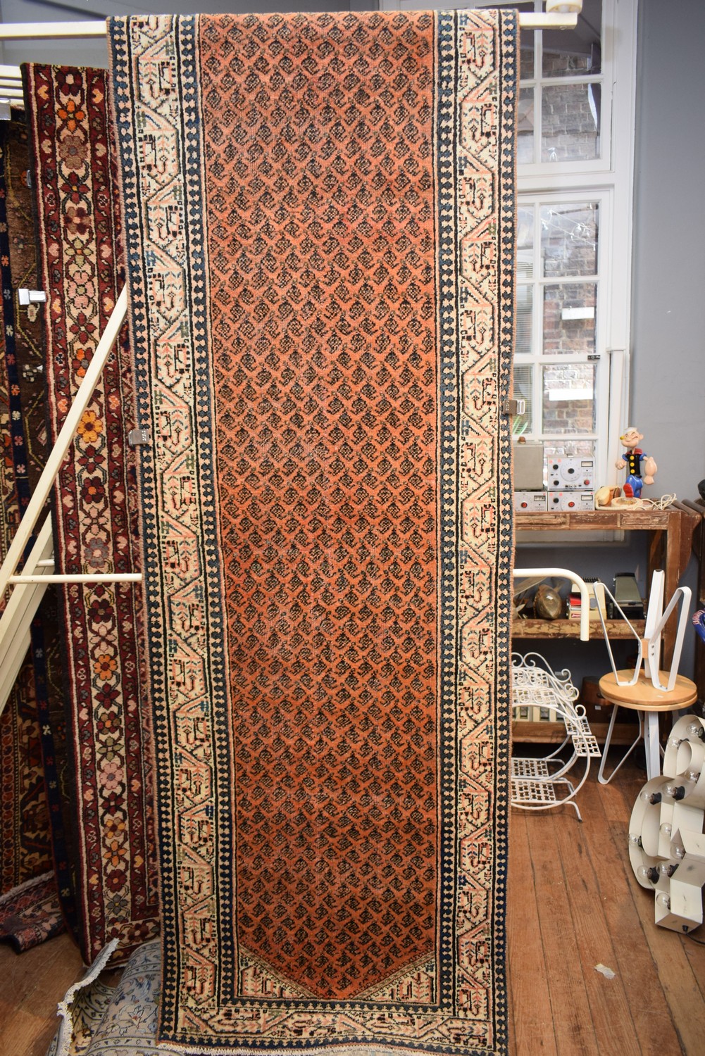 A PERSIAN MIR SERABAND HALL RUNNER, 100% WOOL. SOLID & HARD-WEARING. HAND-KNOTTED VILLAGE WEAVE WITH TRADITIONAL DESIGN OF ALL-OVER MIR BOTEH (PAISLEY) PATTERNS IN A RED FIELD. SCROLL BORDER. GALLERY INVENTORY. IN EXCELLENT CLEAN CONDITION. CERTIFICATE OF AUTHENTICITY INCLUDED. SIZE: 363X89CM, ORIGIN: PERSIA – RRP: $1,900 (MEDIUM ITEM)