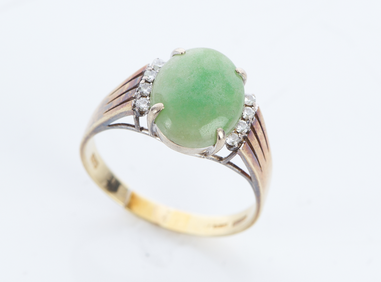 A JADEITE AND DIAMOND RING IN 14CT GOLD (AF), SIZE U-V, 5.5GMS