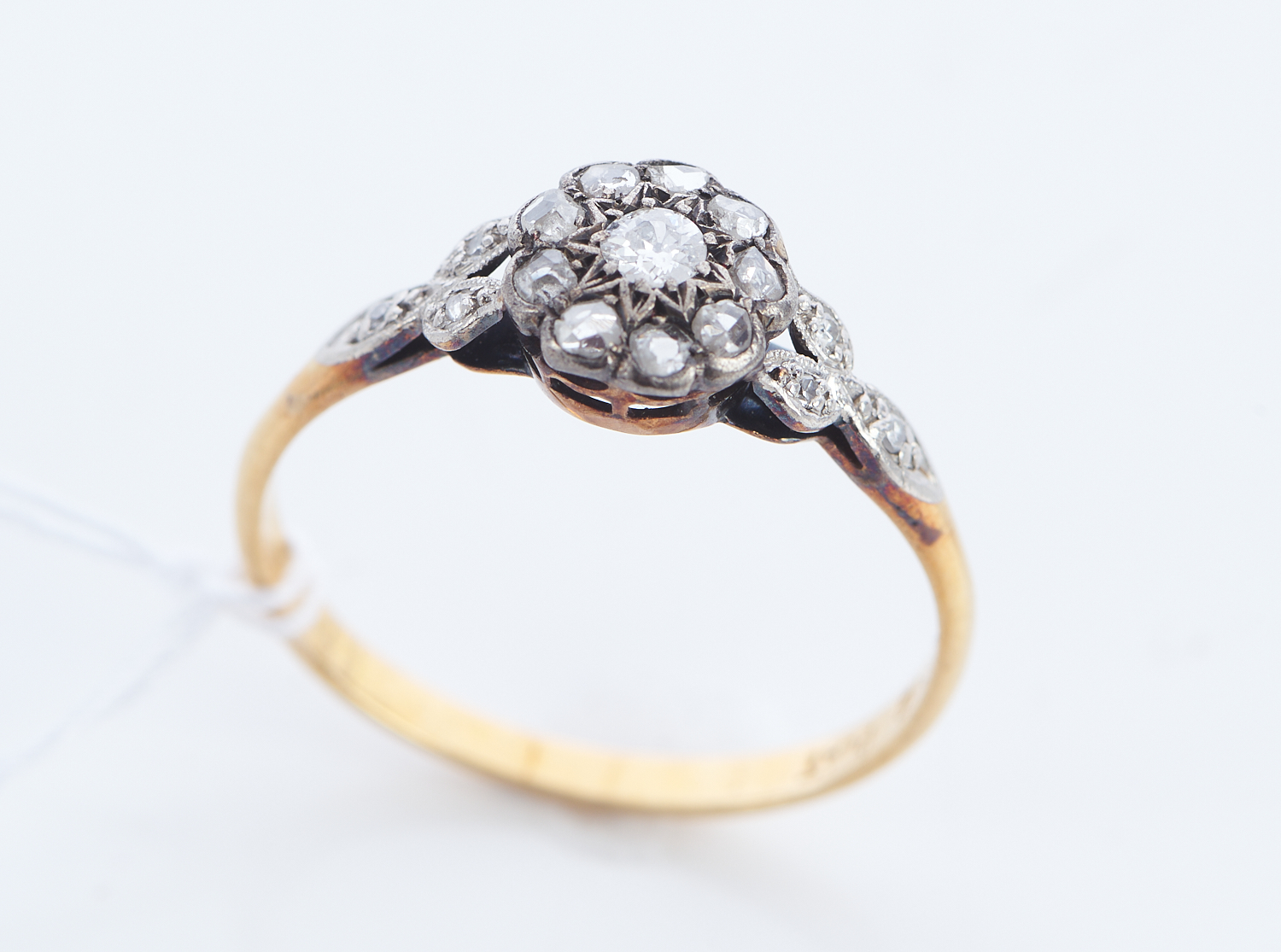 The centre stone estimated in setting 0.10ct, in a surround of rose cut diamonds (showing chips and damage); stamped in the shank "18 plat"