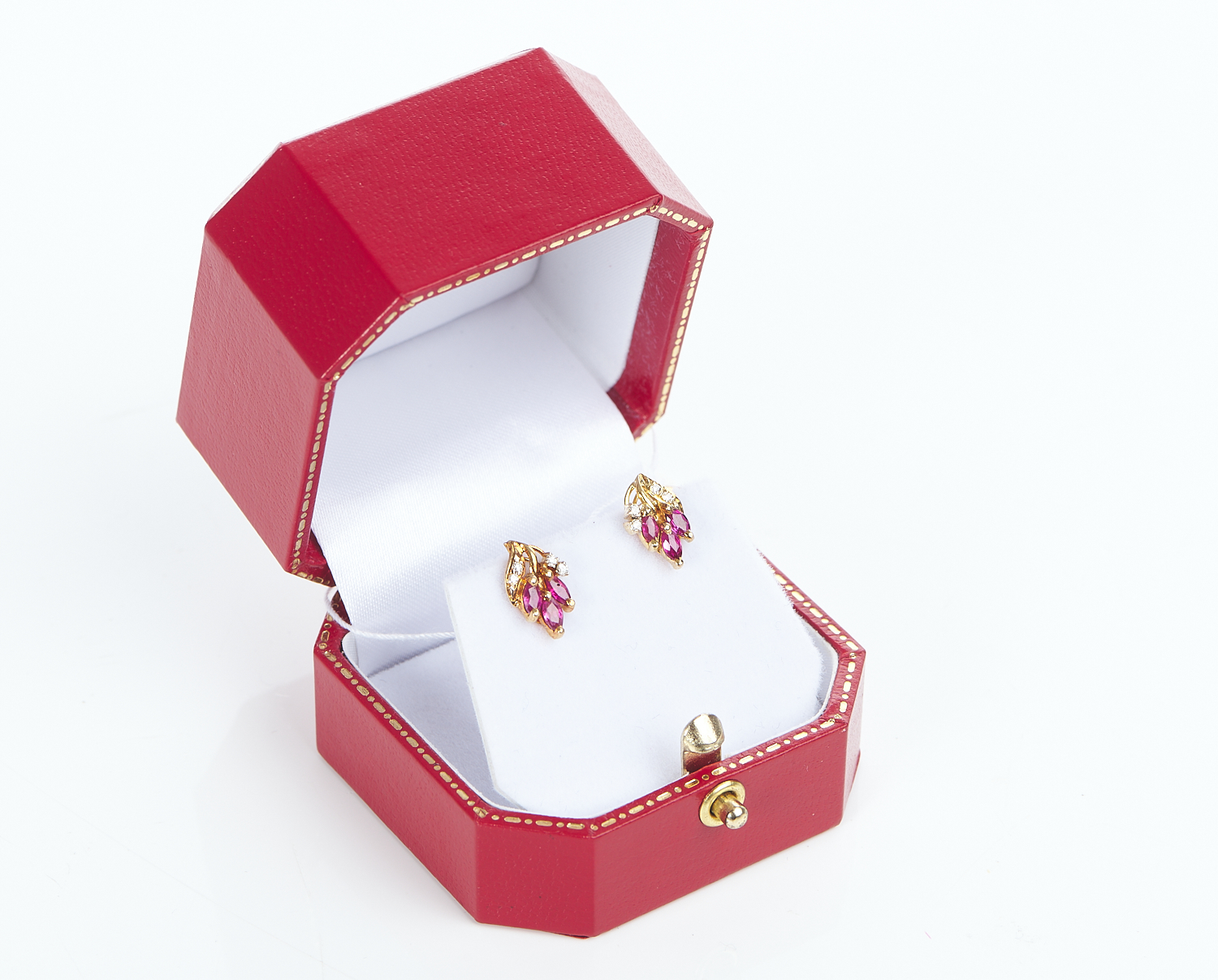 A PAIR OF RUBY AND DIAMOND STUD EARRINGS, TO POST AND BUTTERFLY FITTINGS, IN 14CT GOLD, BOXED, LENGTH 12MM, 1.8GMS