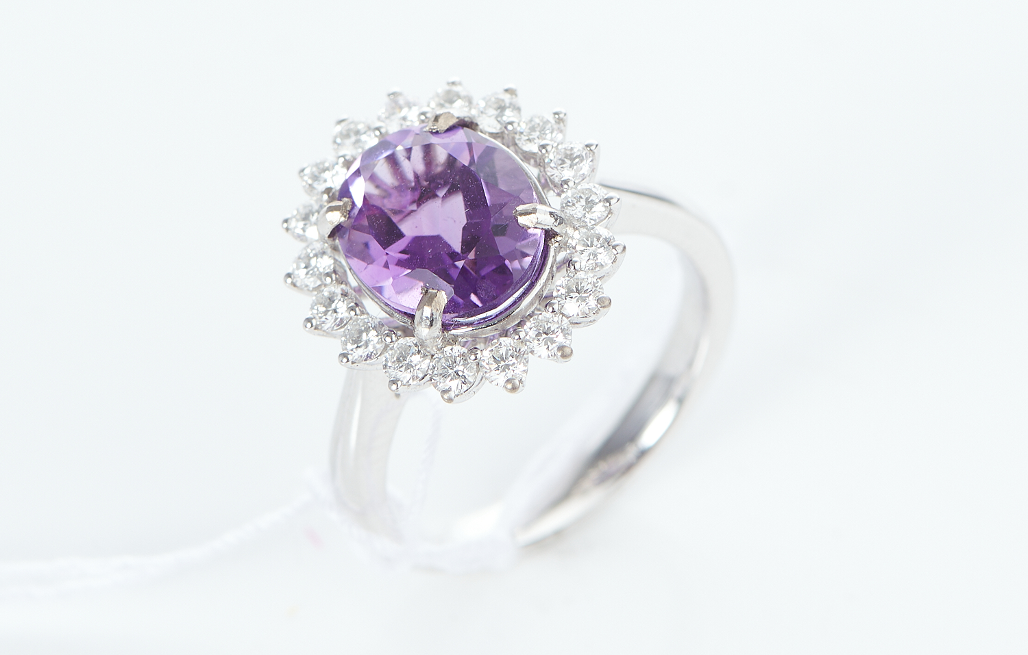 AN AMETHYST AND DIAMOND CLUSTER RING IN 18CT WHITE GOLD, THE OVAL CUT AMETHYST WEIGHING 2.45CTS, WITHIN A SURROUND OF DIAMONDS TOTALLING 0.65CT, SIZE L-M, 6GMS