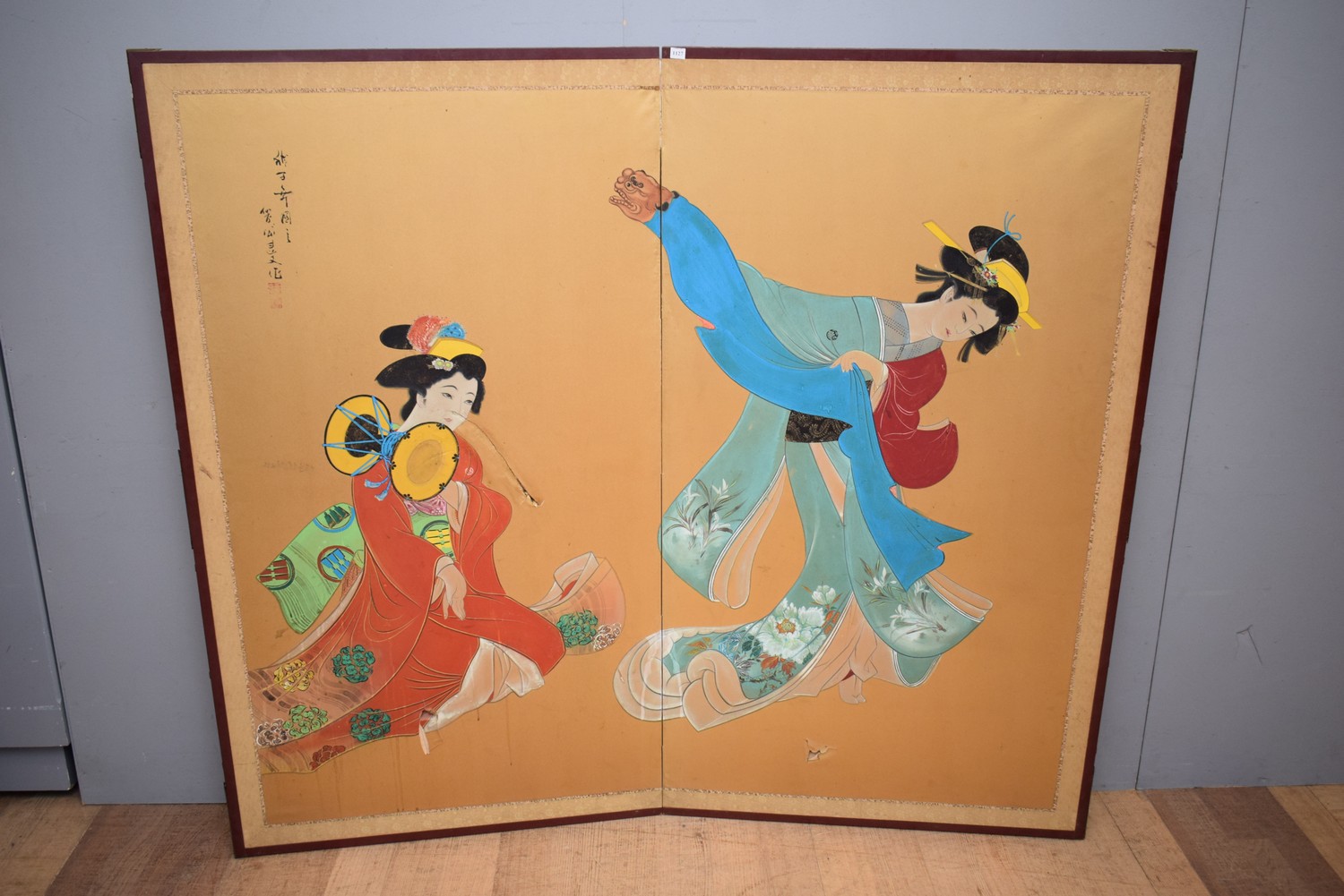 A JAPANESE HAND PAINTED TWO PANEL SCREEN (A/F TEAR TO SCREEN) (156H x 87W CM PER PANEL) (LEONARD JOEL DELIVERY SIZE: MEDIUM)