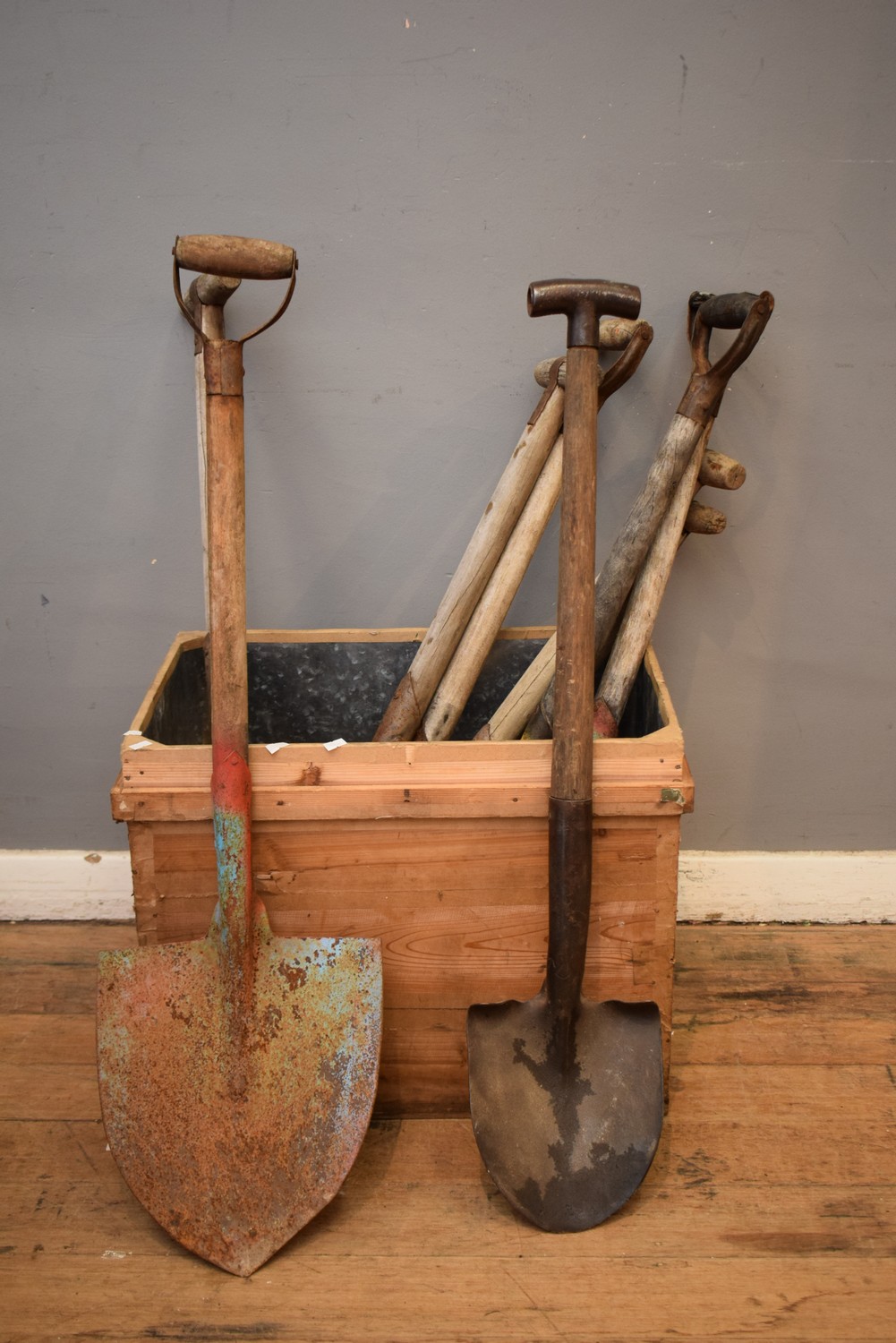 A JAPANESE TEA CHEST WITH A COLLECTION OF VINTAGE SHOVELS (A/F) (45H x 59W x 40d CM) (LEONARD JOEL DELIVERY SIZE: LARGE)