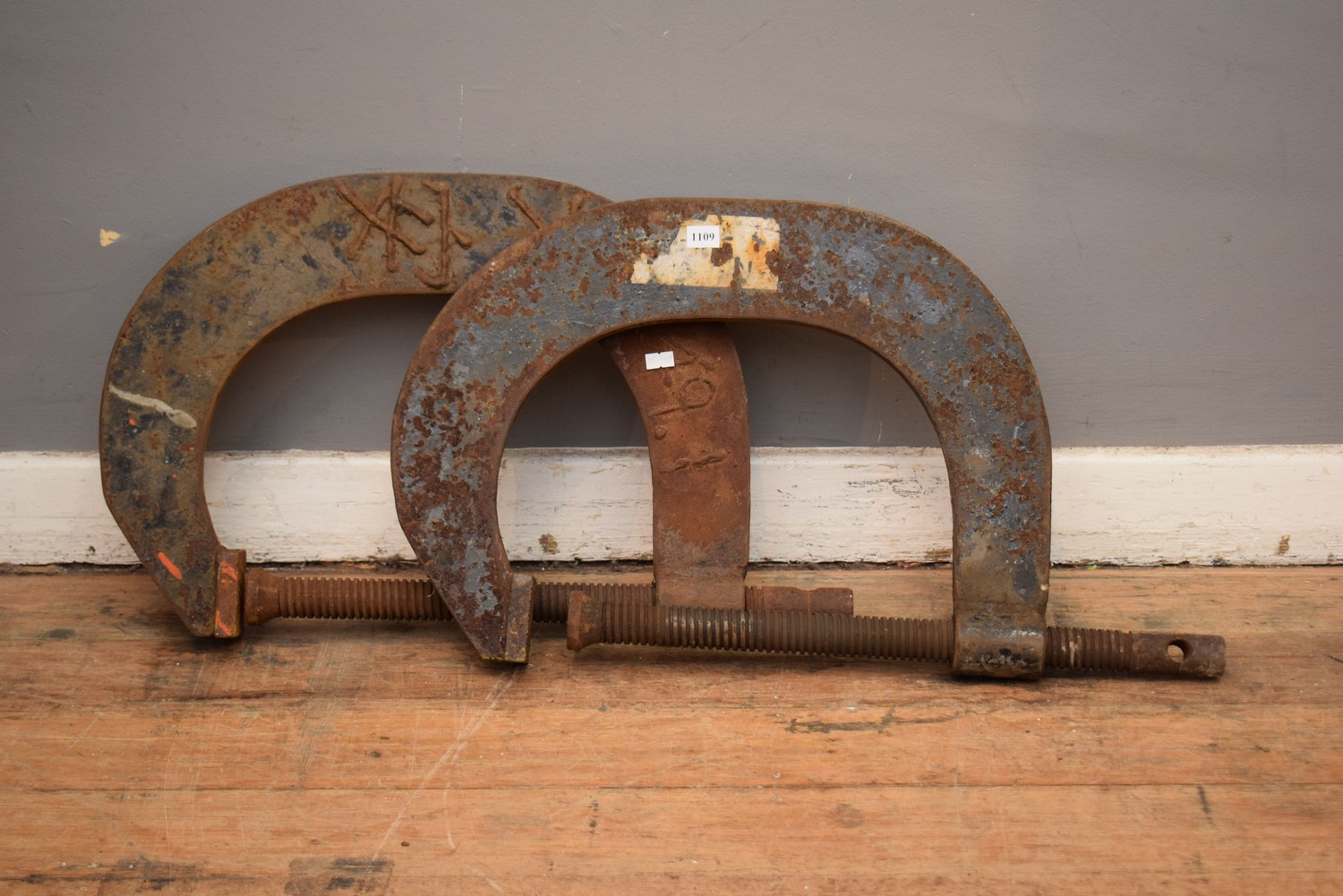 TWO LARGE METAL CLAMPS (A/F) (38H x 64W CM) (LEONARD JOEL DELIVERY SIZE: MEDIUM)
