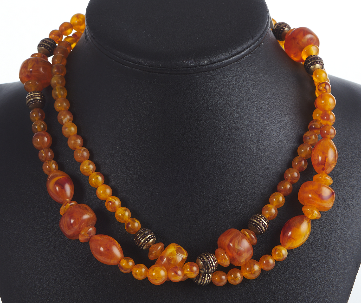 A FAUX AMBER NECKLACE COMPRISING BEADS OF MULTIPLE SIZES, TOTAL 960MM
